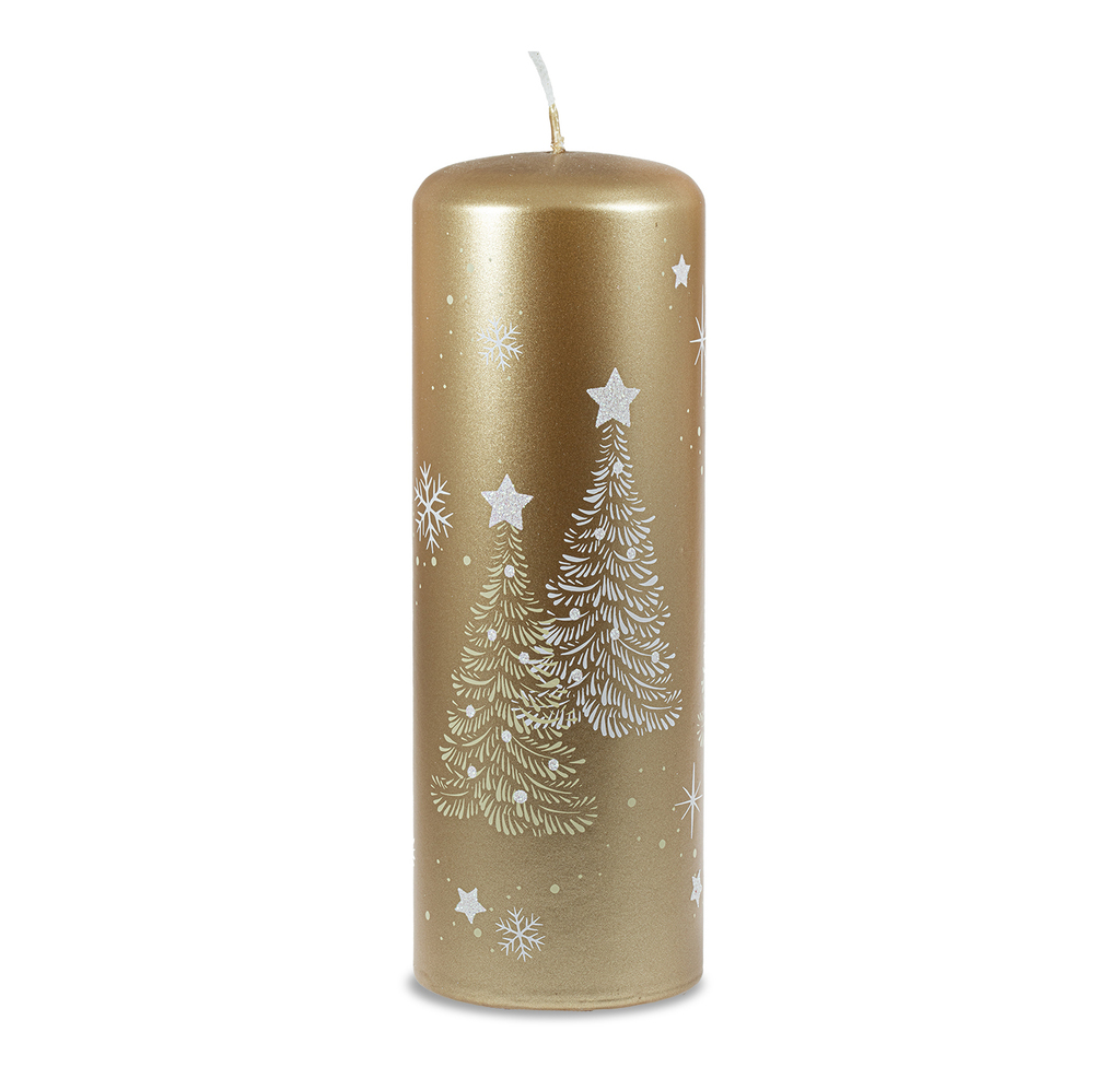 Osvěžte svůj domov teplem a luxusem díky naší zlaté vánoční svíčce o rozměrech 70x200 mm. Lesklý povrch, laděný do zlatavých tónů, spolu s dekorem bílých a krémových stromečků s jemnými třpytivými detaily, vtiskne vašemu prostoru nádech elegance a pohodlí, který oživí vaše vánoční chvíle.