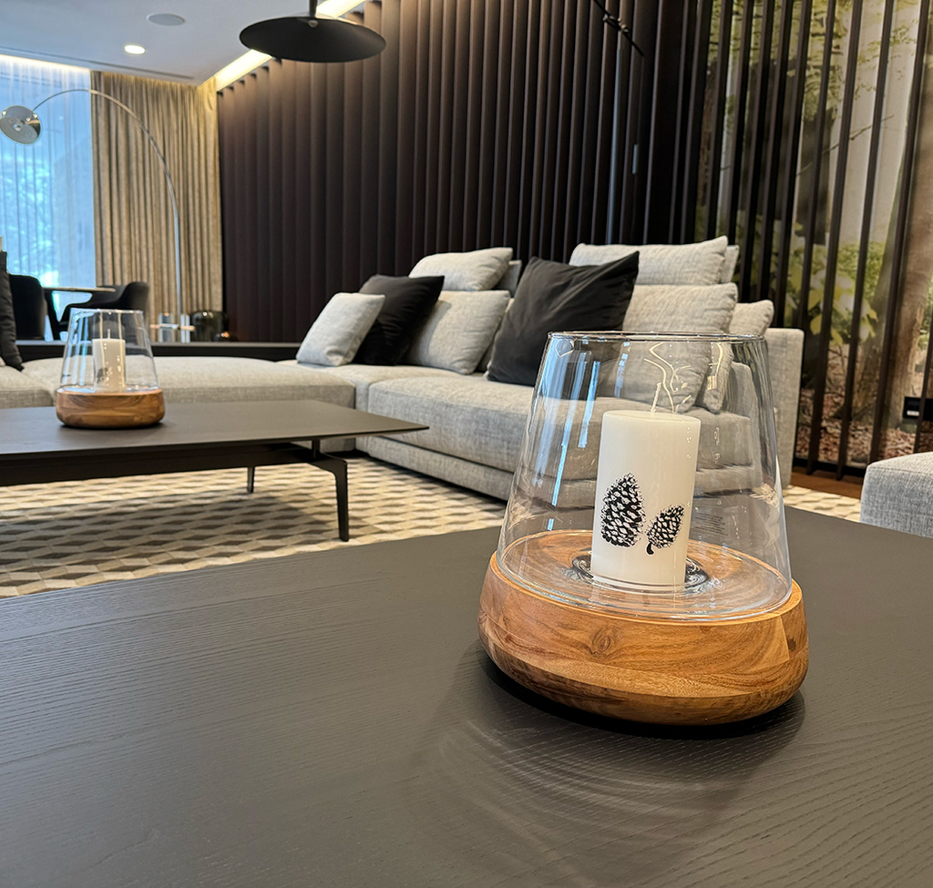 Když se plamen usadí uvnitř, skleněné stěny jej jemně rozostří a dřevěný základ mu dodá příjemné teplo. Velká Ortega vytváří atmosféru klidu, která prostor naplní měkkým, soustředěným světlem a promění jej na místo, kde se chcete na chvíli zastavit.