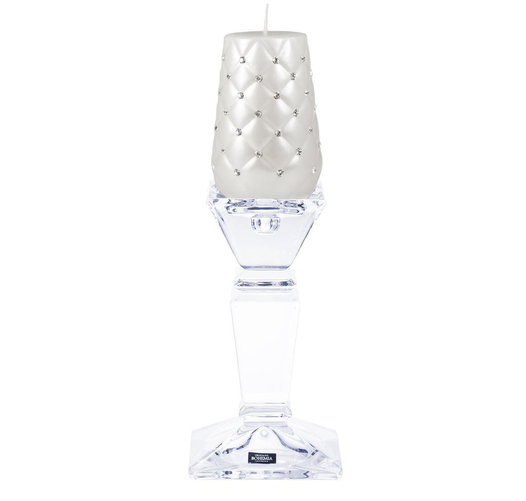 Součástí luxusního dárkového setu je elegantní, metalízově bílá, ručně zdobená svíčka s PRECIOSA kamínky (Cone 80 x 120 mm).