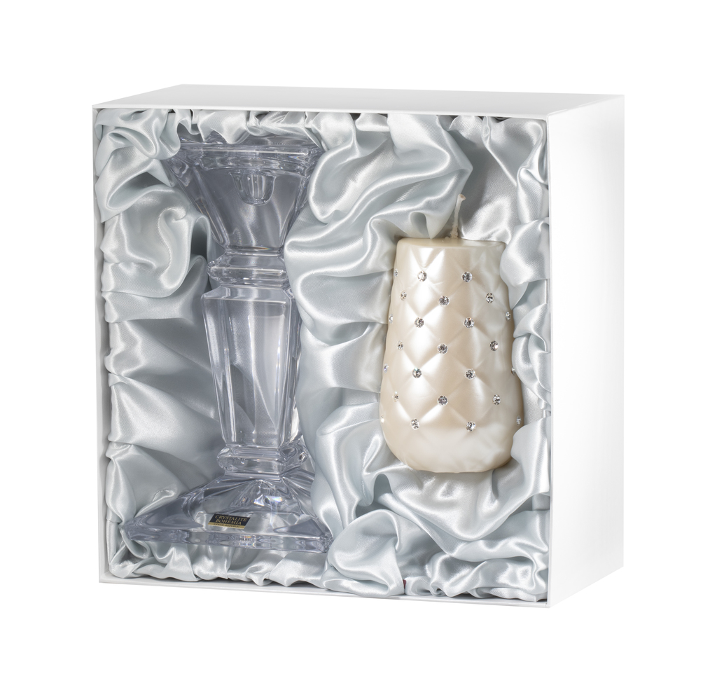 Set dále obsahuje křišťálový svícen Bohemia Crystal a vše je zabaleno do perleťově bílé dárkové krabice.
