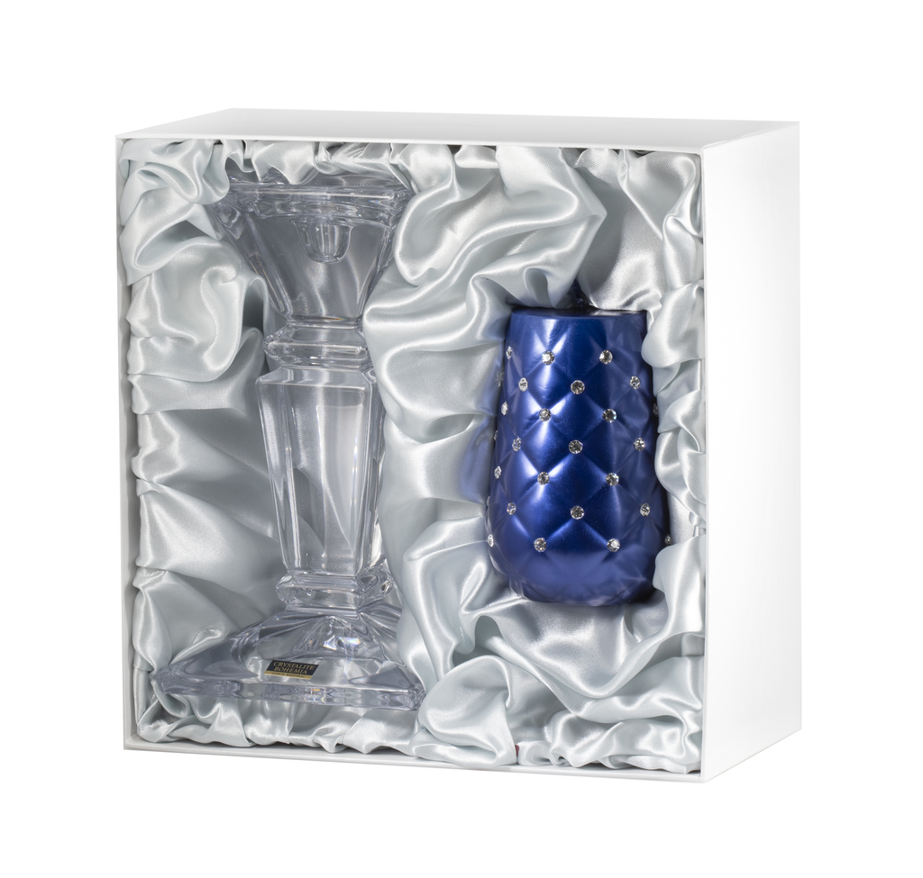 Set dále obsahuje křišťálový svícen Bohemia Crystal a vše je zabaleno do perleťově bílé dárkové krabice.