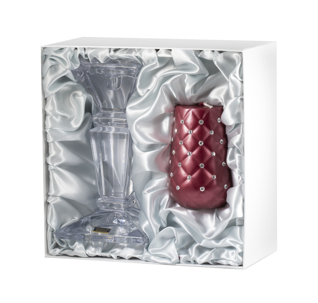 Set dále obsahuje křišťálový svícen Bohemia Crystal a vše je zabaleno do perleťově bílé dárkové krabice.