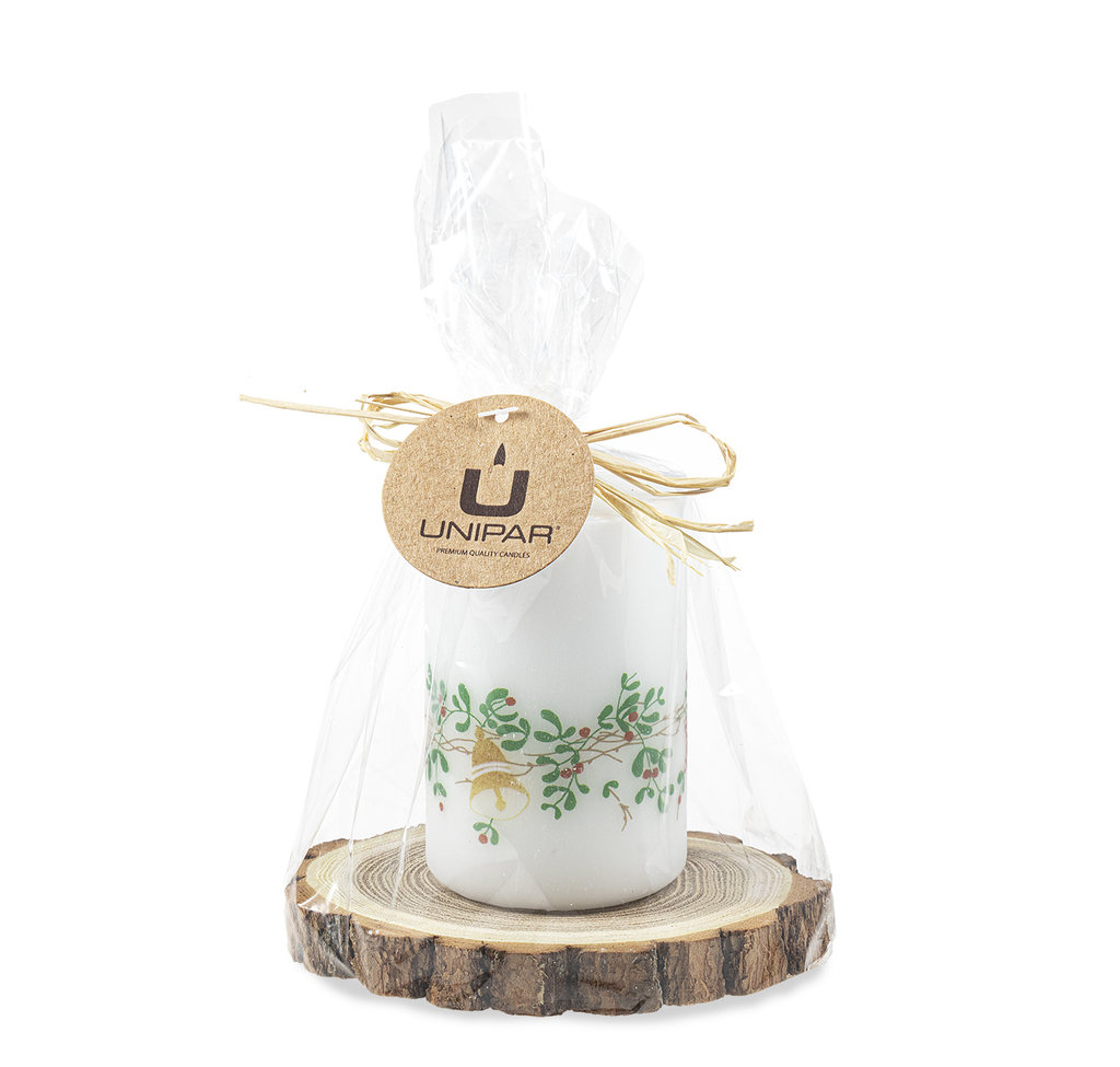 Dárkový balíček svíčky z kolekce Girlande (50-75 mm) s barevným motivem girlandy na dřevěné podložce.