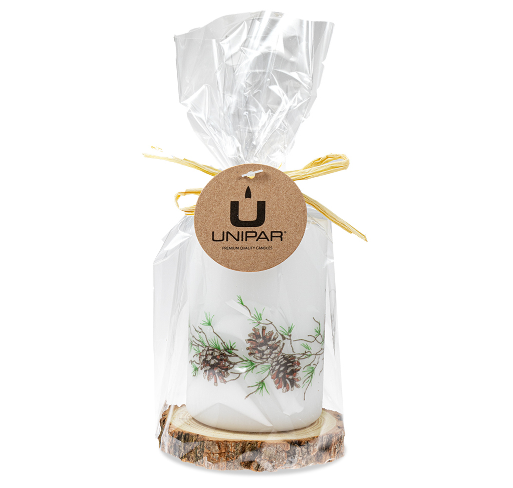 Dárkový balíček s malou svíčkou kolekce Pine je milým zimním pozdravením. Svíčka je umístěna na přírodní dřevěné podložce, která podtrhuje její lesní charakter. Celý balíček je zabalen do čirého celofánu a zdoben jemnou mašlí – ideální malý dárek, který potěší každého milovníka zimní atmosféry a elegantního designu.