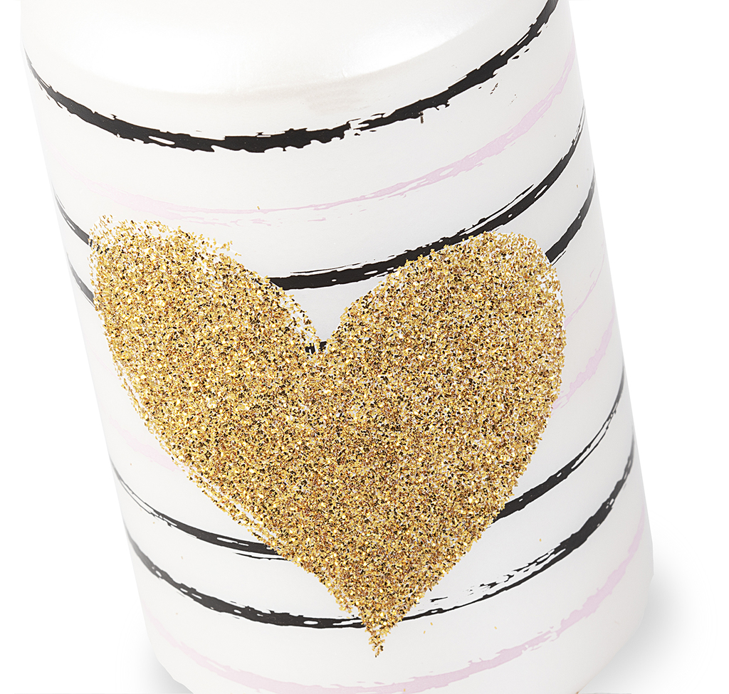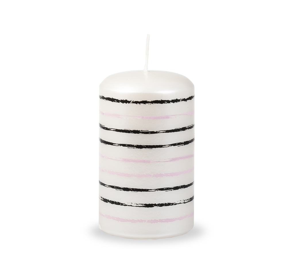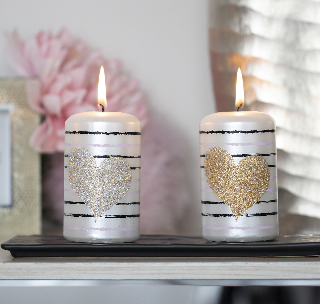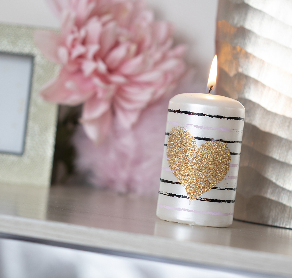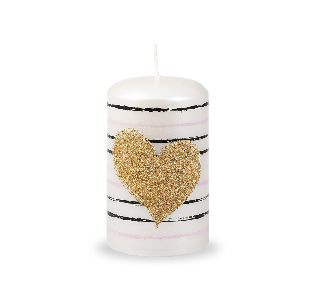 Perleťově bílá svíčka zdobená proužky v černé a růžové barvě, z přední strany překryté velkým srdcem se zlatým třpytem.