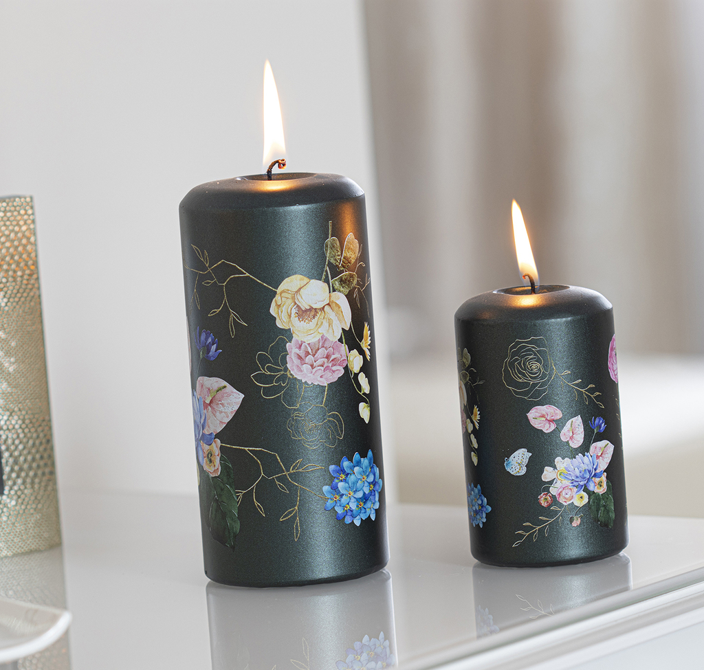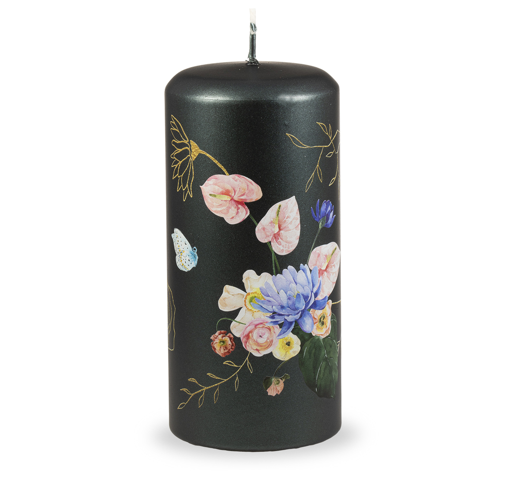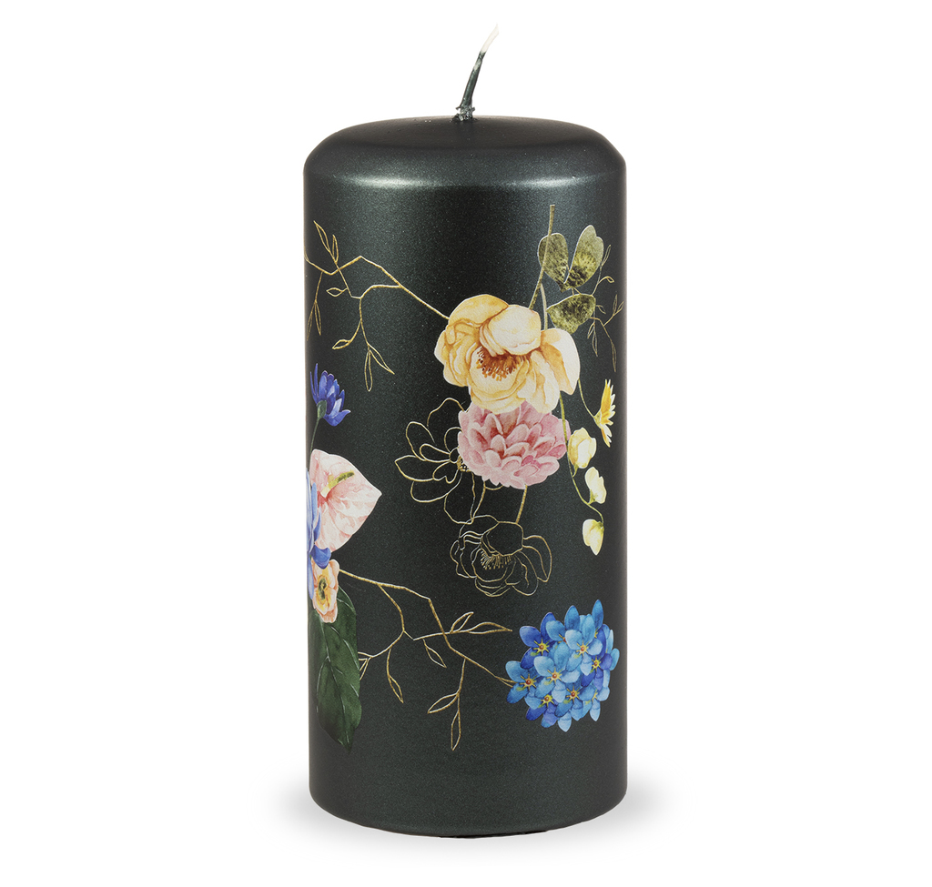 Svíčka má tmavý černozelený metalický podklad s tiskem krásných pestrobarevných květů, které jsou doplněné jemným zlatým obrysem květin.