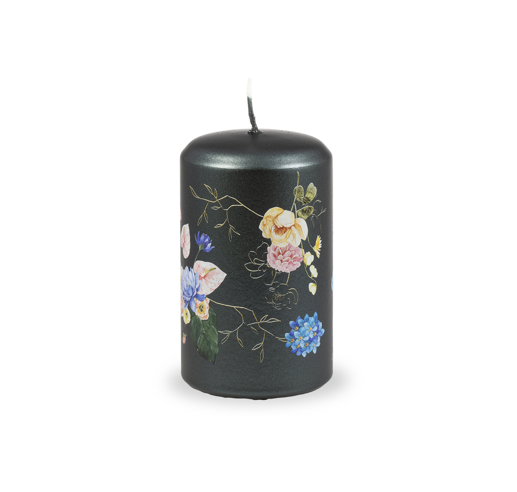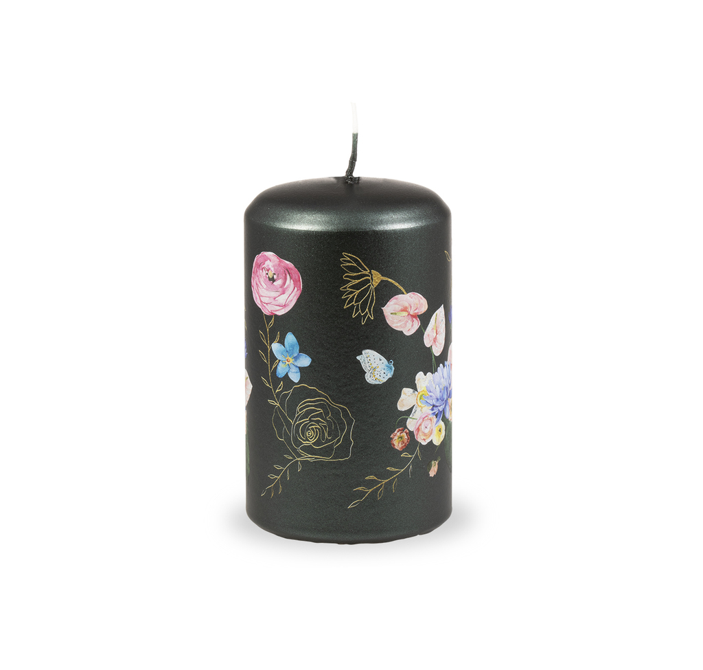 Svíčka má tmavý černozelený metalický podklad s tiskem krásných pestrobarevných květů, které jsou doplněné jemným zlatým obrysem květin.