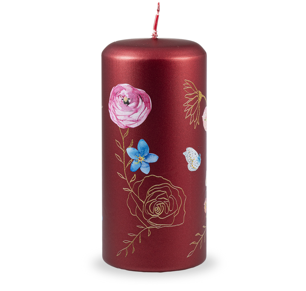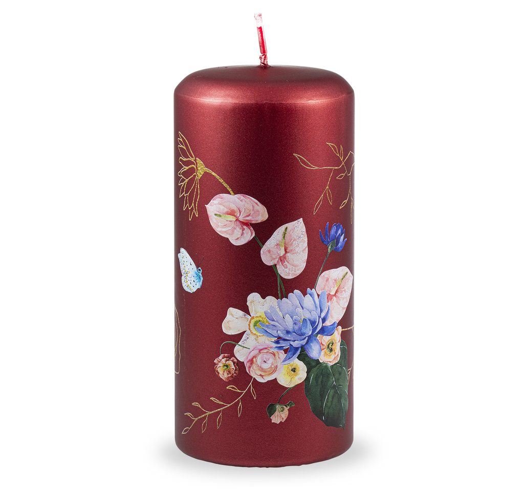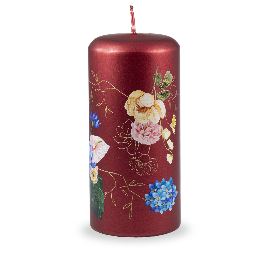 Svíčka má červený metalický podklad s tiskem krásných pestrobarevných květů, které jsou doplněné jemným zlatým obrysem květin.