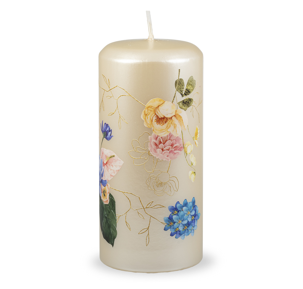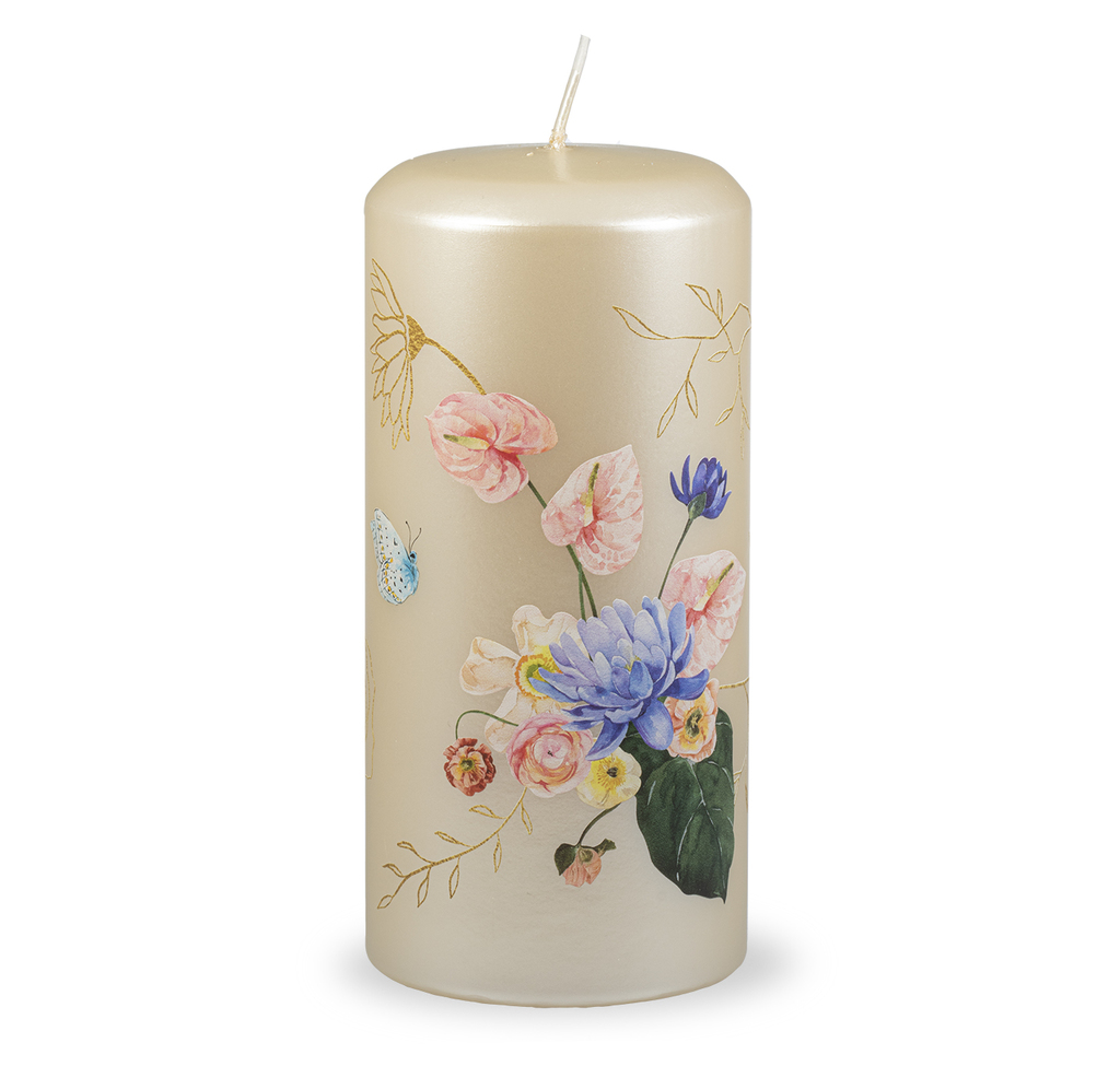 Svíčka má krémový metalický podklad s tiskem krásných pestrobarevných květů, které jsou doplněné jemným zlatým obrysem květin.