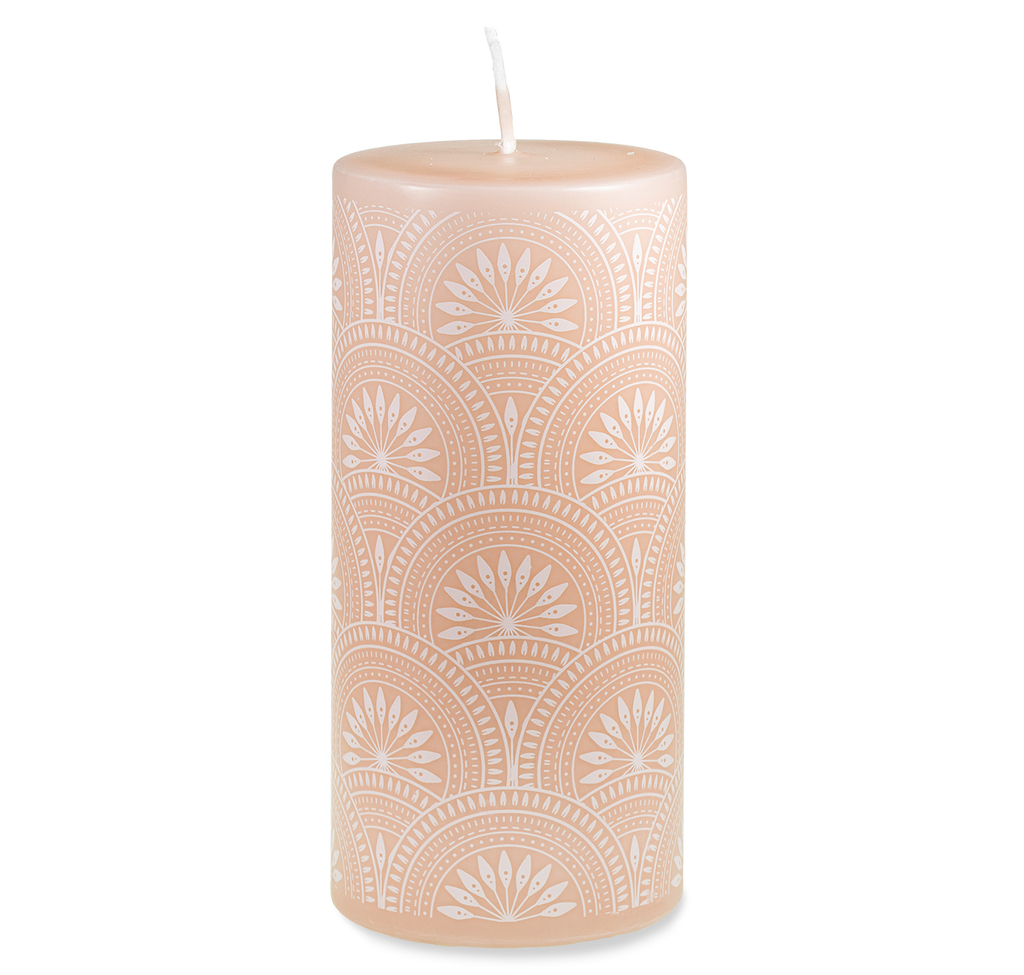 Jemná pastelově oranžová svíčka s dekorem velkých bílých květinových vějířků vás krásně naladí na přicházející teplé dny.