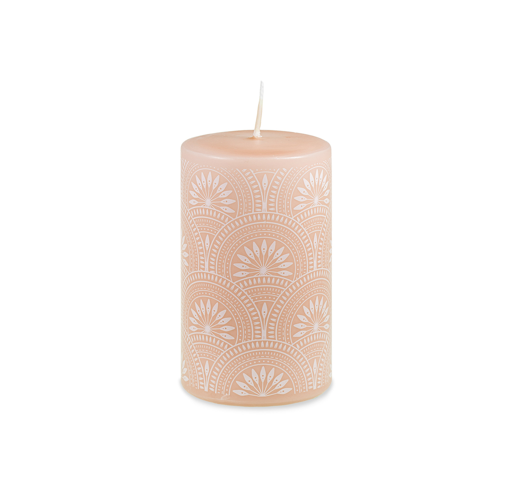 Jemná pastelově oranžová svíčka s dekorem velkých bílých květinových vějířků vás krásně naladí na přicházející teplé dny.