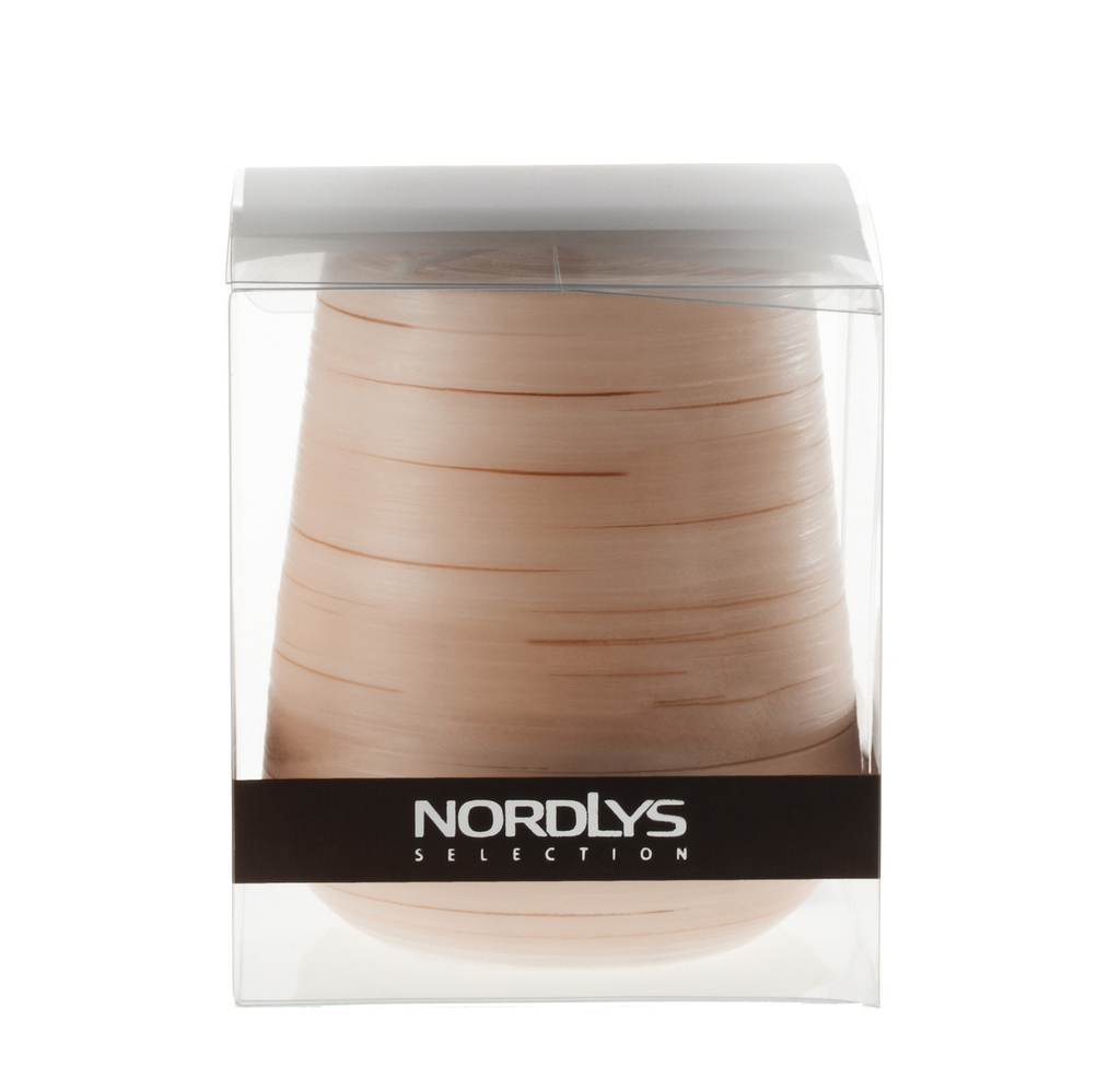 Elegantní pudrová svíčka ve skandinávském stylu se strukturovaným povrchem, ručně dozdobená linkami v barvě terracotta.