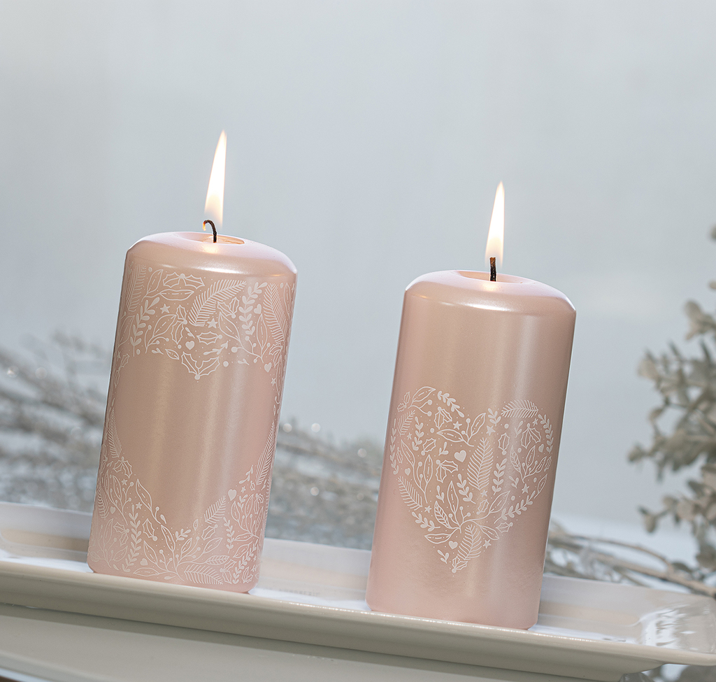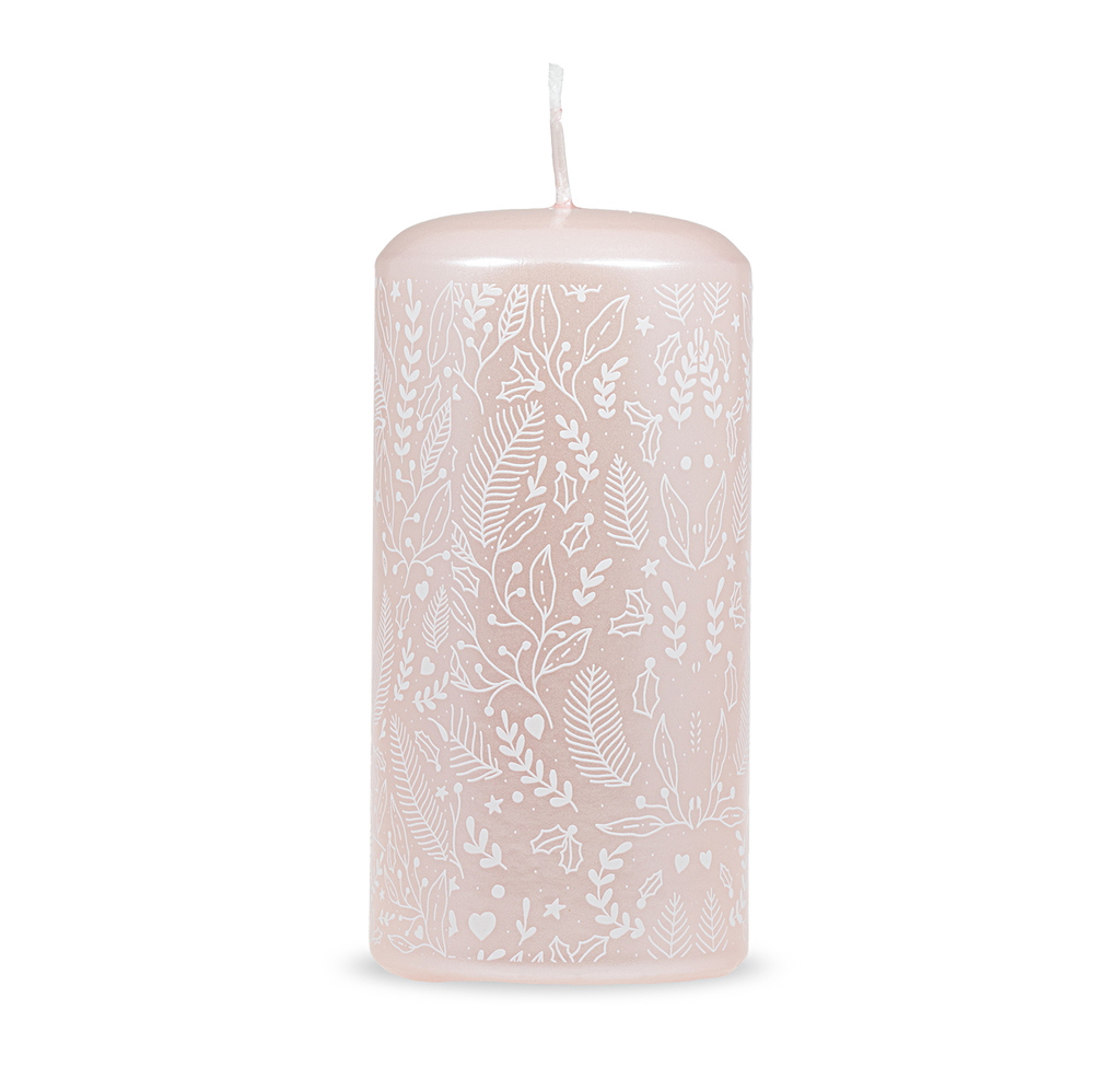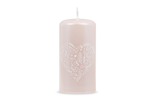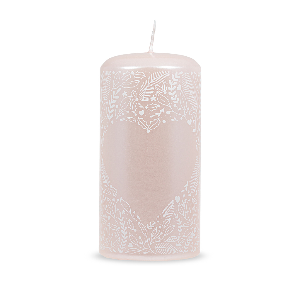 Svíčka v ledově růžové barvě s krásným zimním motivem po celé svíčce, který vytvoří z přední části tvar srdce.
