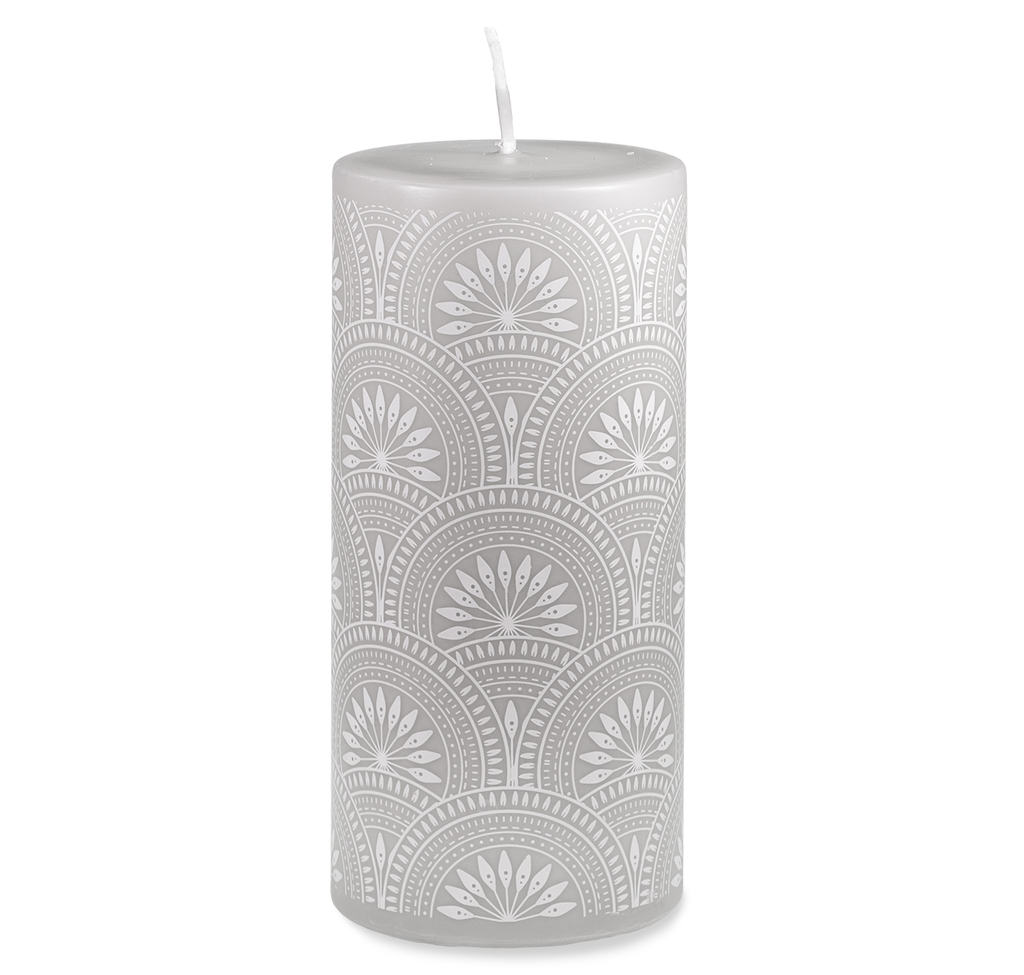 Elegantní šedá svíčka s dekorem velkých bílých květinových vějířků vás krásně naladí na přicházející teplé dny.
