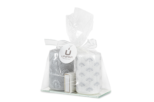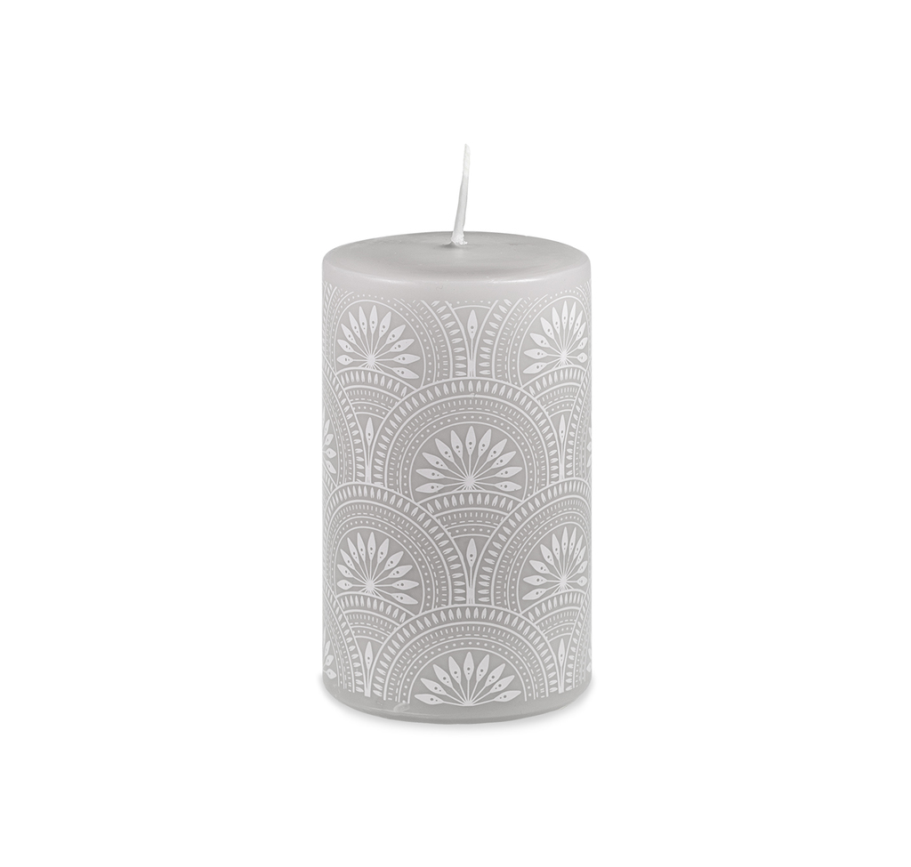 Elegantní šedá svíčka s dekorem velkých bílých květinových vějířků vás krásně naladí na přicházející teplé dny.