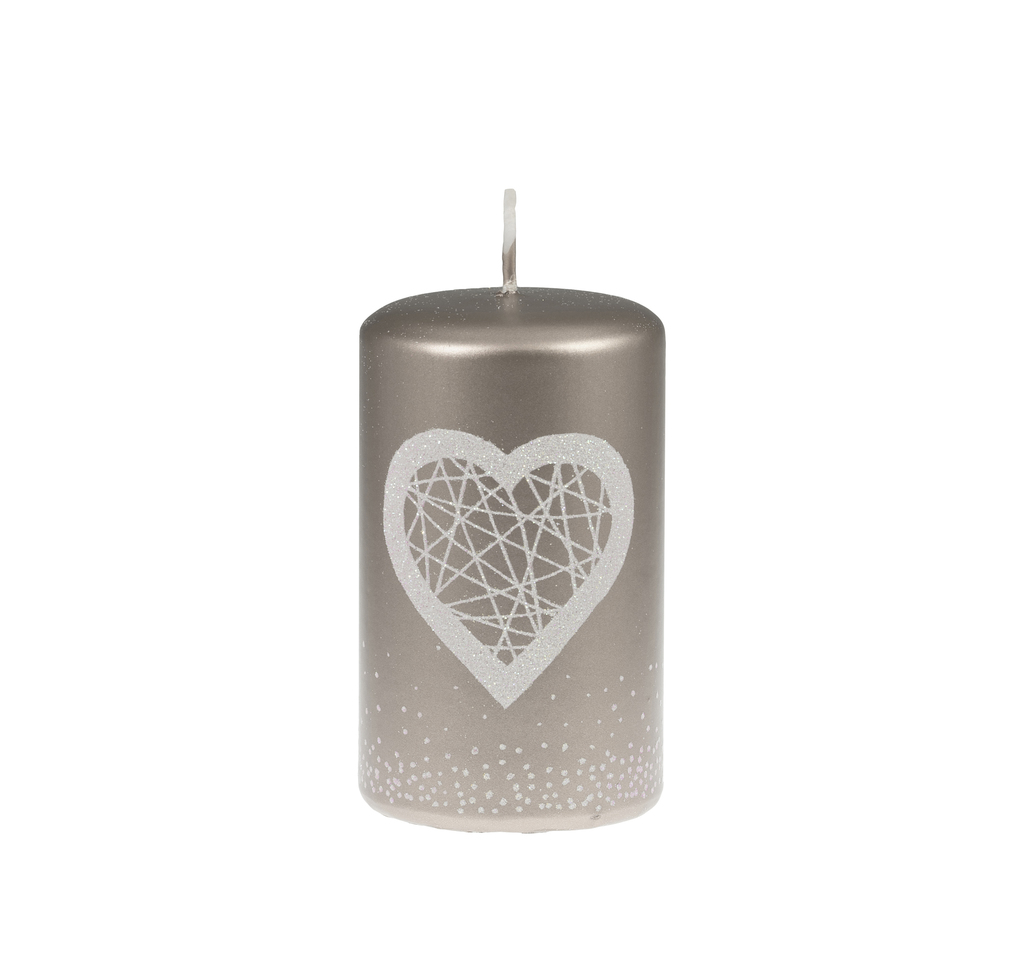 Střední svíčka v moka šedé metalické barvě s jemným třpytivým dekorem ve tvaru srdíčka.