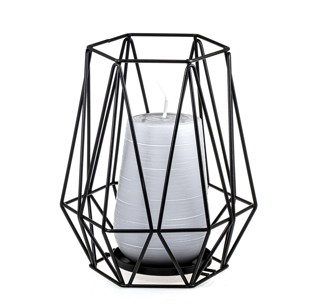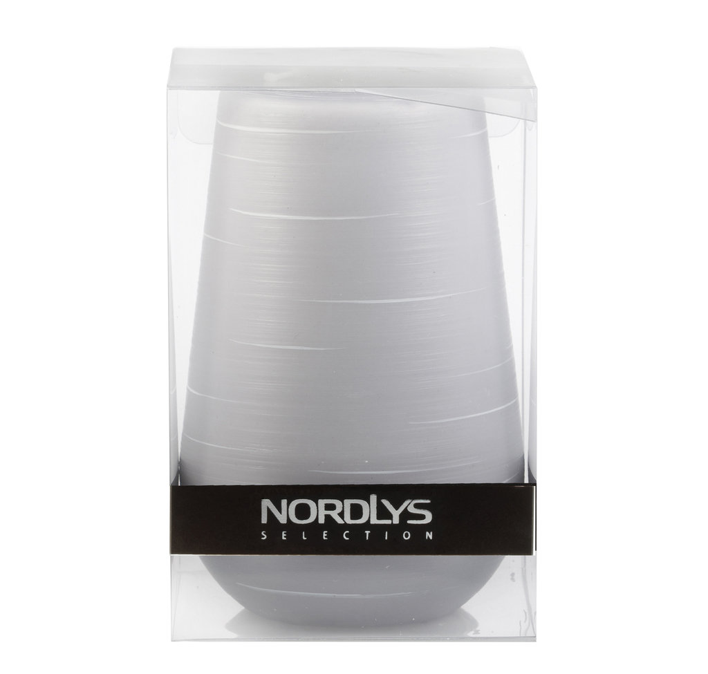 Elegantní šedá svíčka ve skandinávském stylu se strukturovaným povrchem, ručně dozdobená bílými linkami.