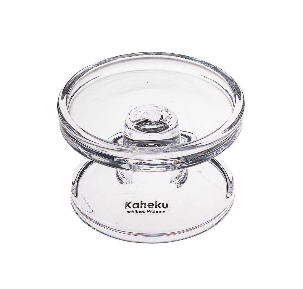 Svícen z čirého skla značky Kaheku. Svícen lze použít z obou stran. Z jedné strany je vhodný pro svíčky do průměru 8 cm, z druhé strany je svícen pro kónickou svíčku.
