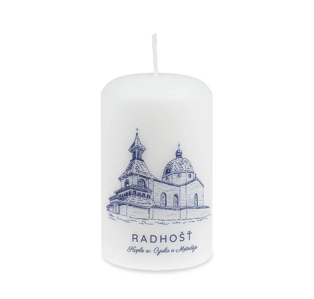 Sametově bílá svíčka s modrou perokresbou kapličky Cyrila a Metoděje, která je postavena na dominantní hoře Radhošť v srdci Beskyd.
