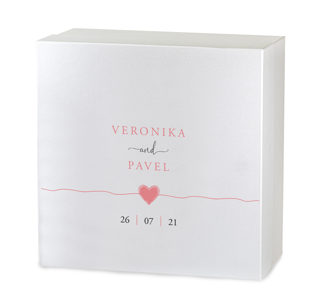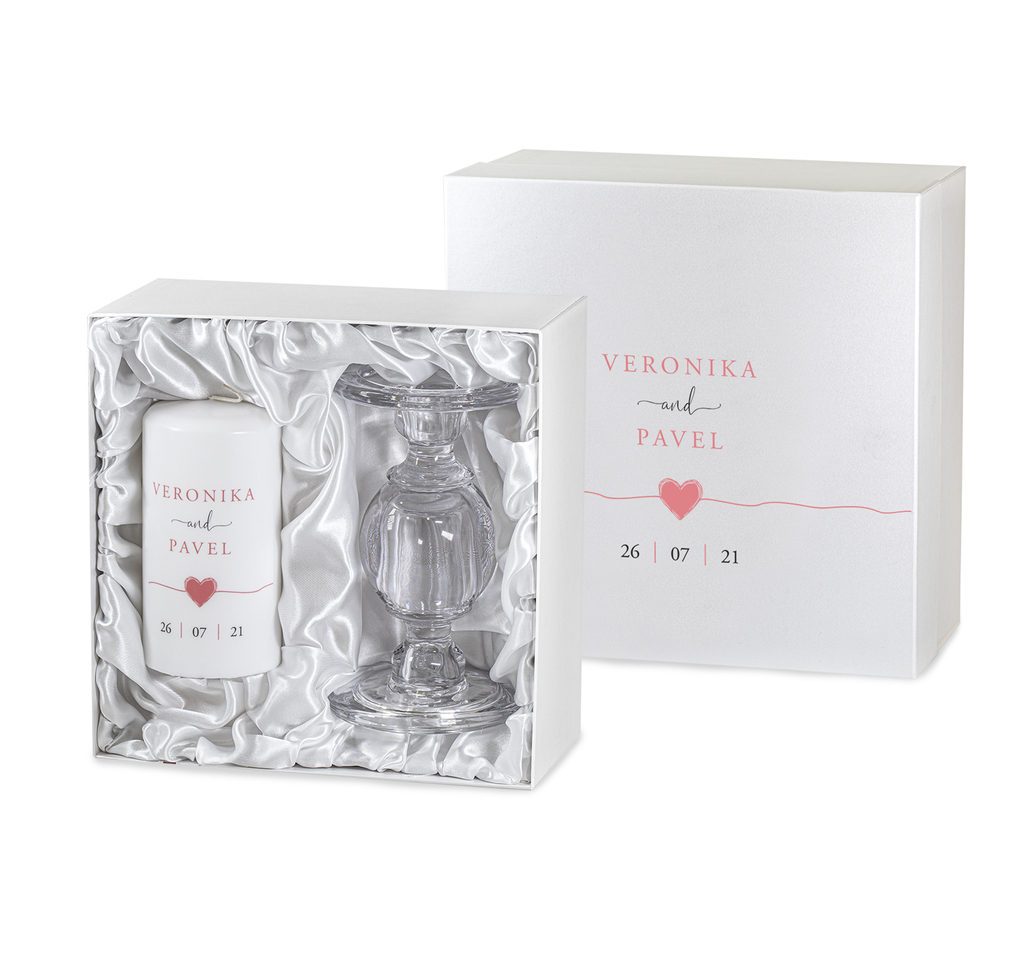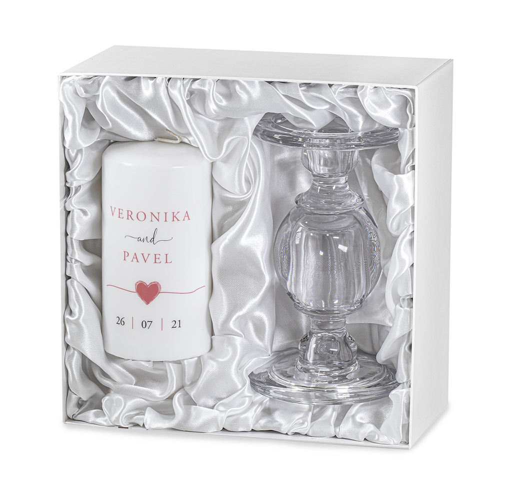 Vše je zabaleno do perleťově bílé dárkové krabice, na které bude stejný vzor jako na svíčce, včetně jmen.