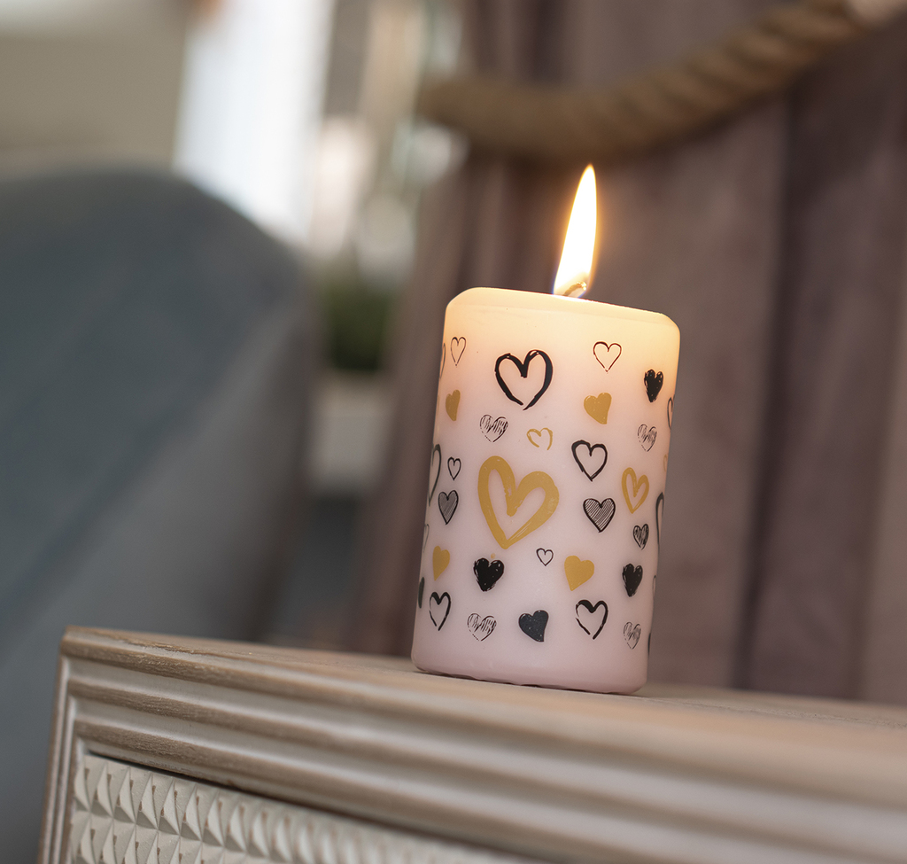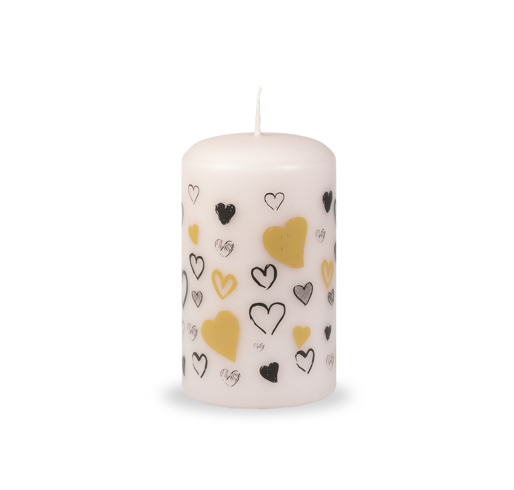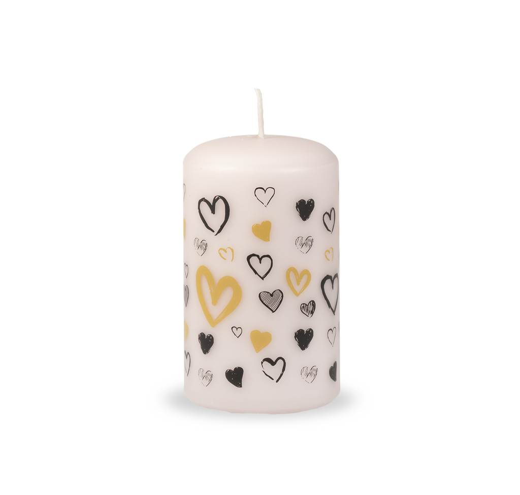 Svíčka ve světle růžové barvě potištěná srdíčky různých velikostí. Srdíčka jsou v barvě hořčicové a černé.