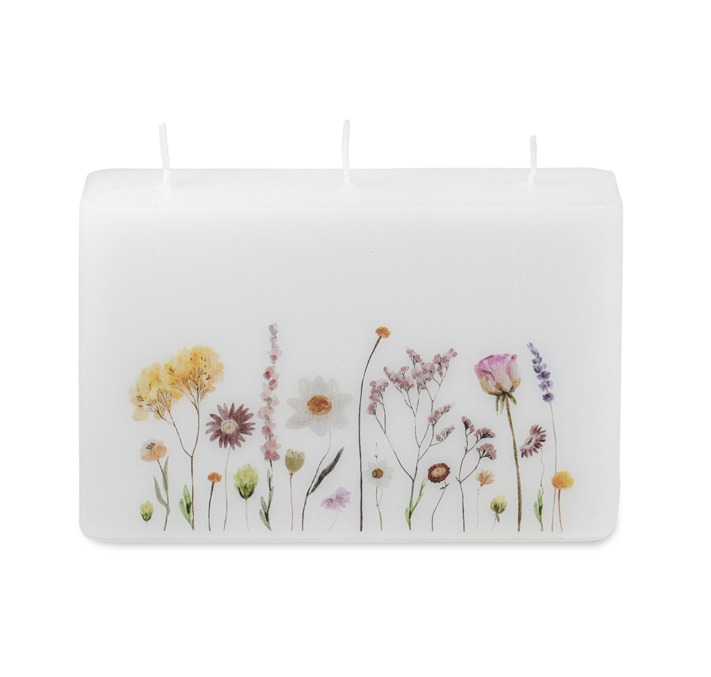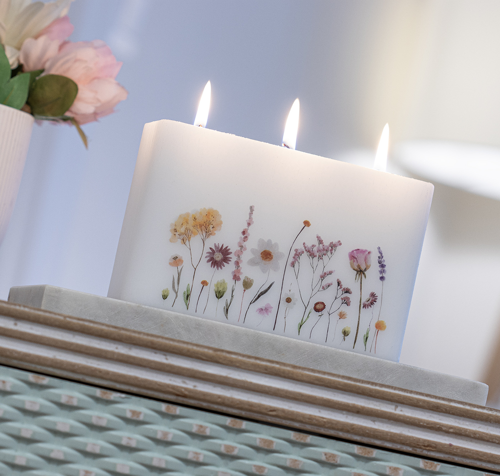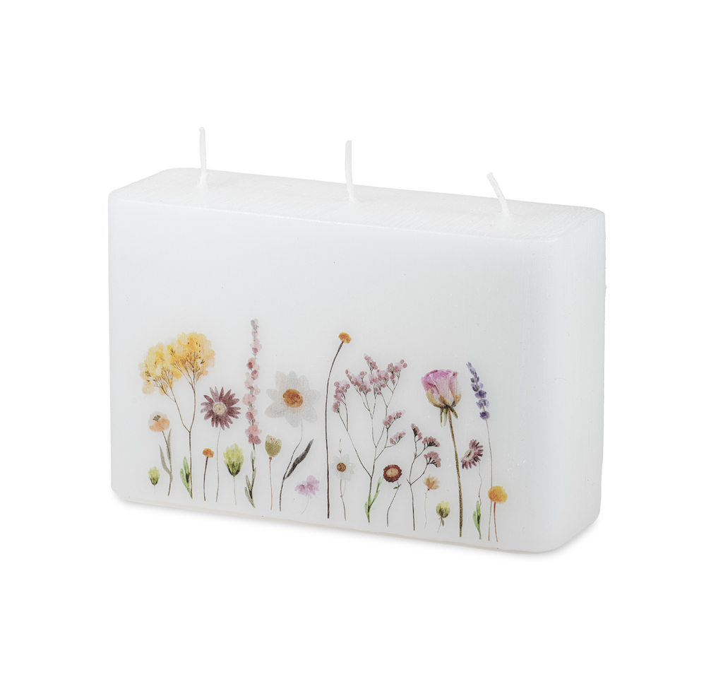 Studie provedená v Dánsku zjistila, že právě tři plamínky dokážou nejlépe neutralizovat rušivé účinky modrého světla, čímž přispívají k lepšímu odpočinku a pohodlnějšímu sledování obrazovky večer. Motiv lučních květin, zpracovaný jako ruční akvarelová kresba, přináší do prostoru přirozenou krásu a harmonii. Ručně broušený povrch dodává svíčce autentický rustikální vzhled.