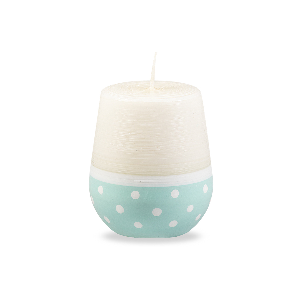 Část svíčky je zdobená tyrkysovou barvou s bílými puntíky a část svíčky má ručně zdobený strukturovaný povrch.