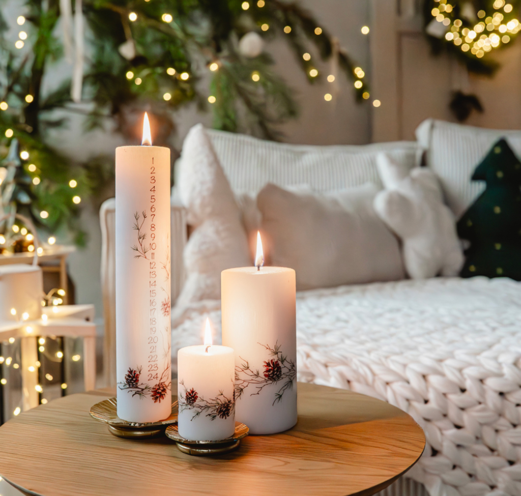 Vyšší válec z kolekce Pine vnese do prostoru výraznější, ale stále klidnou dominantu. Precizní tisk borovicových větviček se na vyšší ploše krásně rozvine a zvýrazní ručně broušený povrch svíčky. Díky své výšce působí elegantně a je vhodný jak na slavnostní stůl, tak na zimní aranžmá vedle luceren či přírodních dekorací.