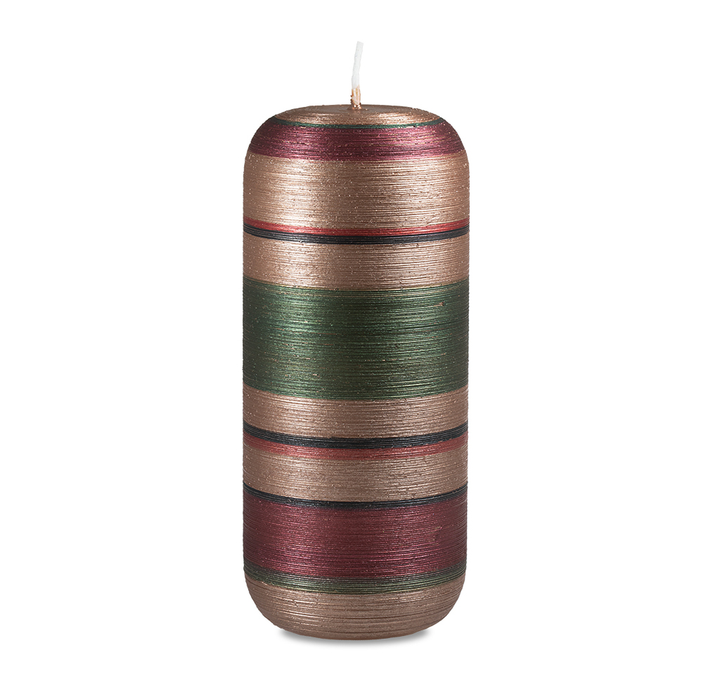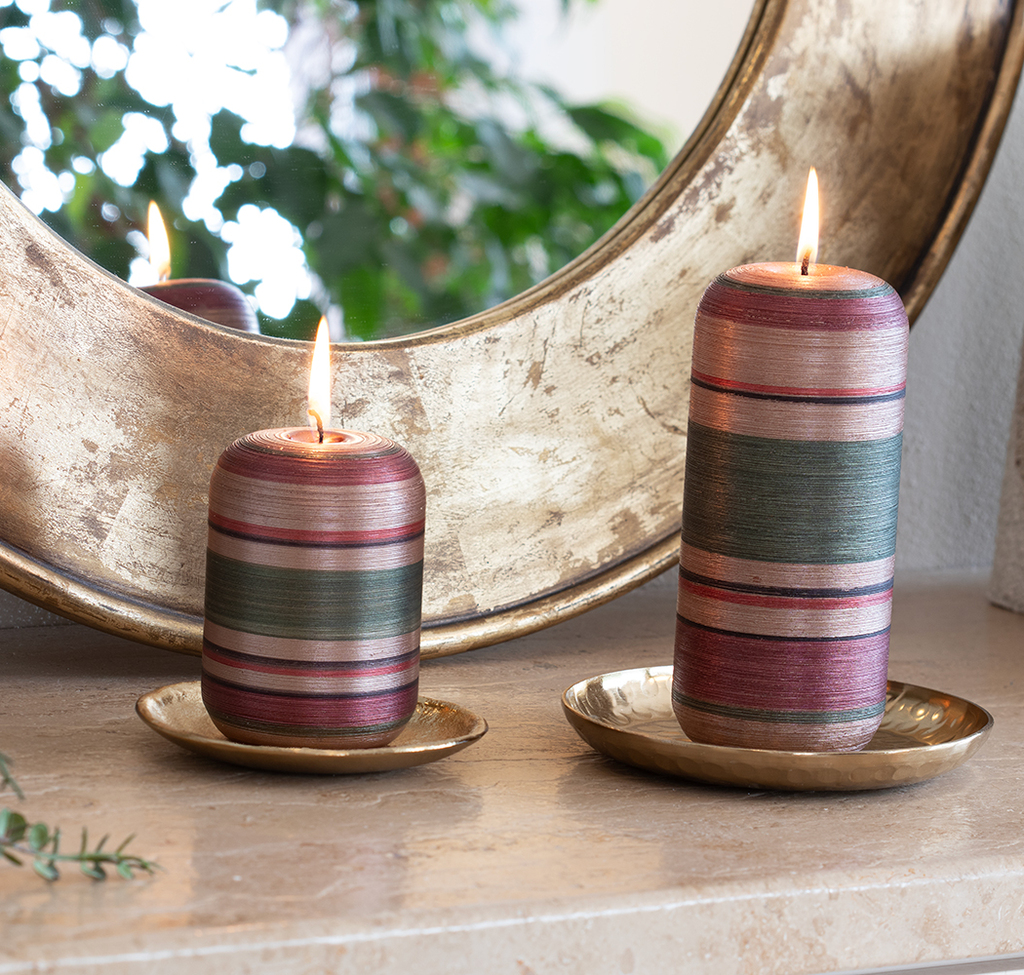 Vysoká svíčka Jaipure (70×160 mm) se stane dominantou každého interiéru. Její výrazné barevné pruhy v tónech metalické hnědé, vínové a zelené s jemnými černými liniemi jsou nanášeny ručně štětcem, což zaručuje originalitu každého kusu.