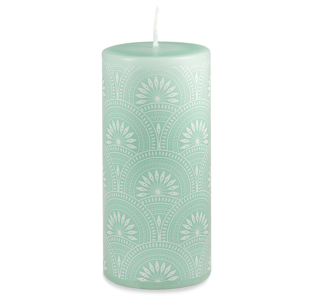 Krásná tyrkysová svíčka s dekorem velkých bílých květinových vějířků vás krásně naladí na přicházející teplé dny.
