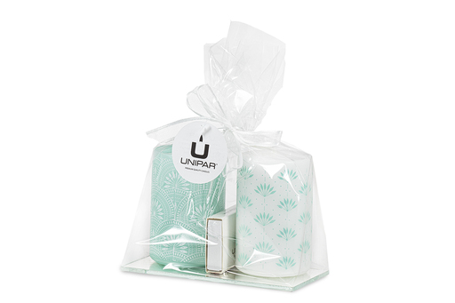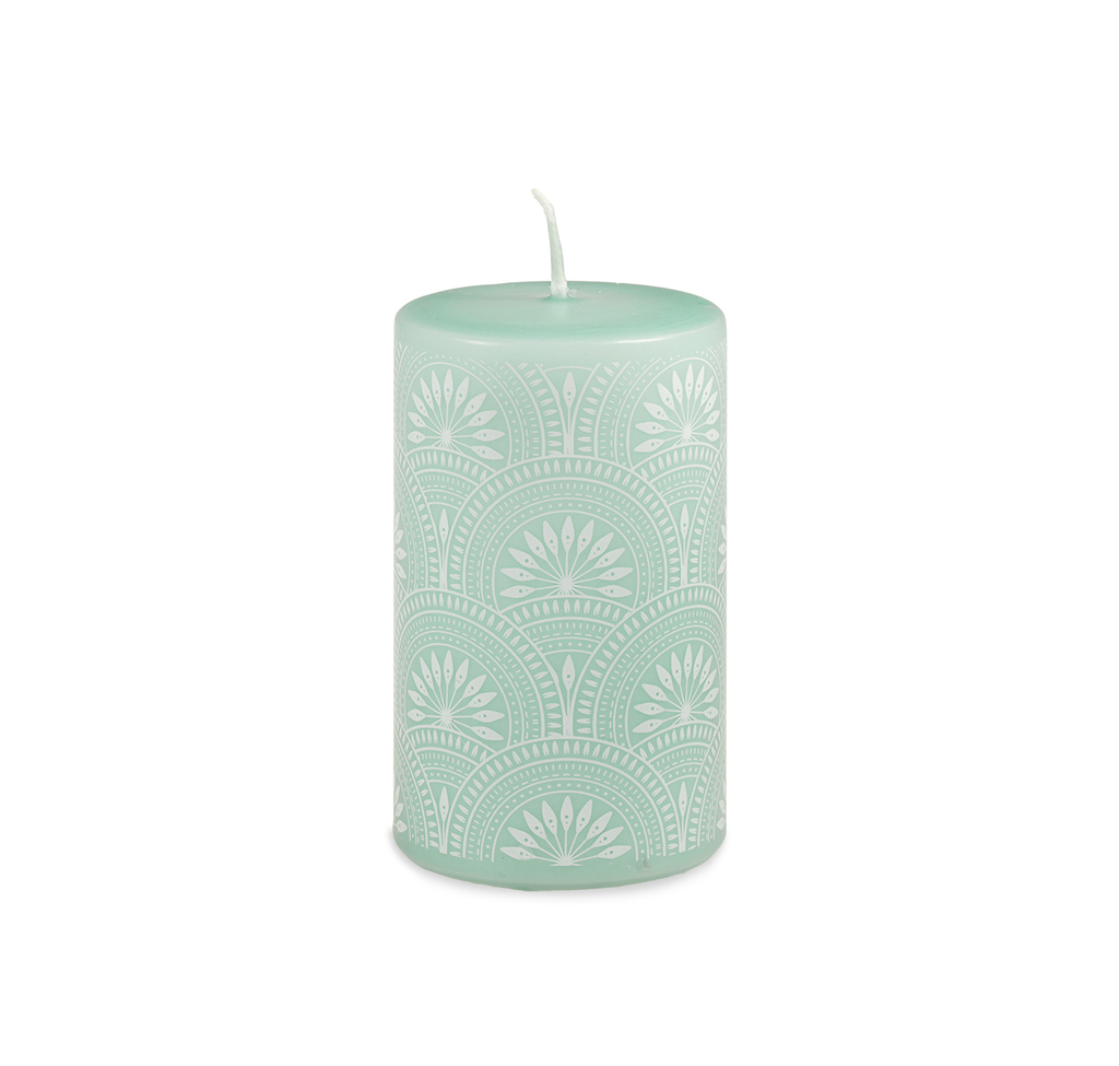 Krásná tyrkysová svíčka s dekorem velkých bílých květinových vějířků vás krásně naladí na přicházející teplé dny.