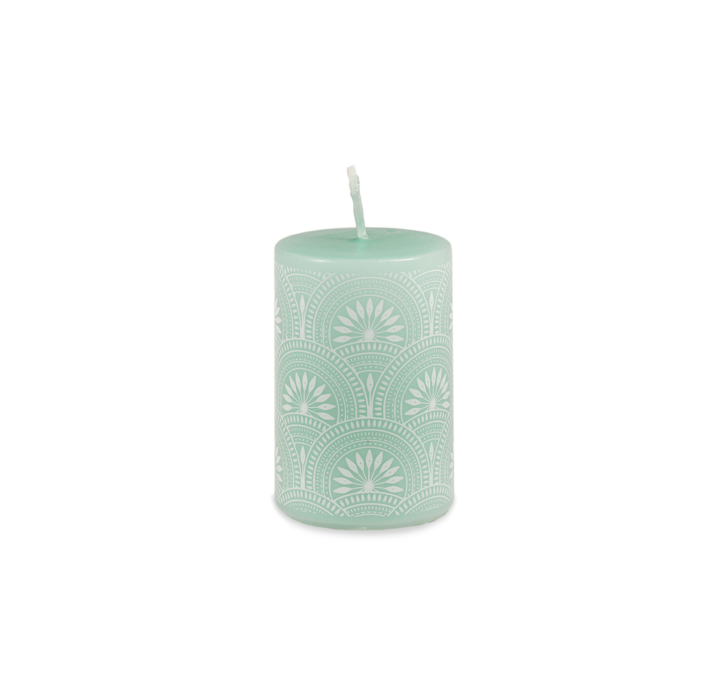 Elegantní tyrkysová svíčka s dekorem velkých bílých květinových vějířků vás krásně naladí na přicházející teplé dny.