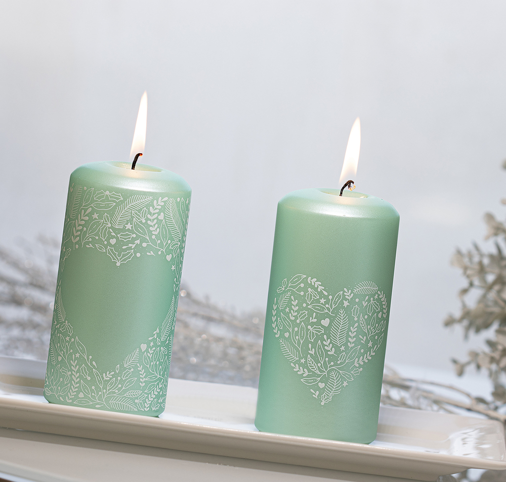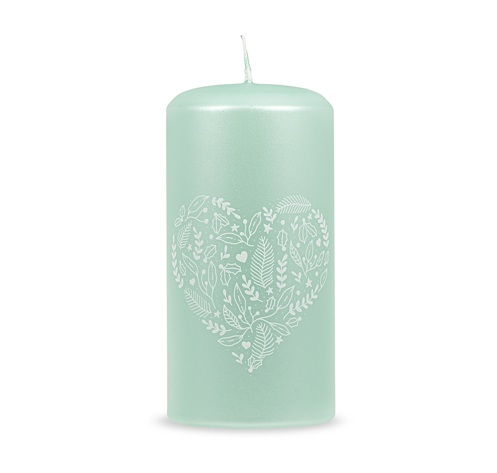Svíčka v ledově tyrkysové barvě s krásným zimním motivem ve tvaru srdce.
