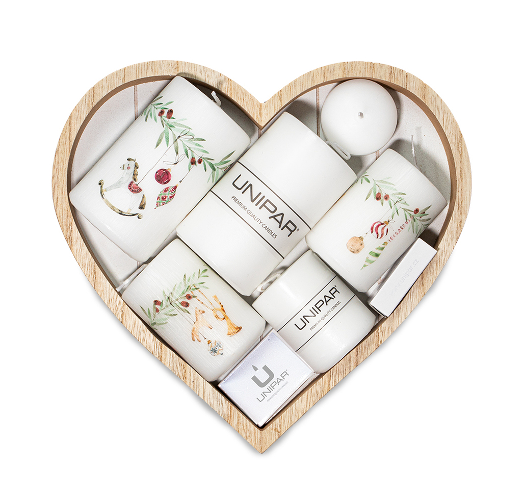 Je to jako vánoční příběh uložený do jednoho dárku. Svíčky různých velikostí, doplněné o drobnosti na dřevěném srdci, vytvářejí pocit domova – toho opravdového, kde světlo hřeje stejně jako blízkost rodiny.