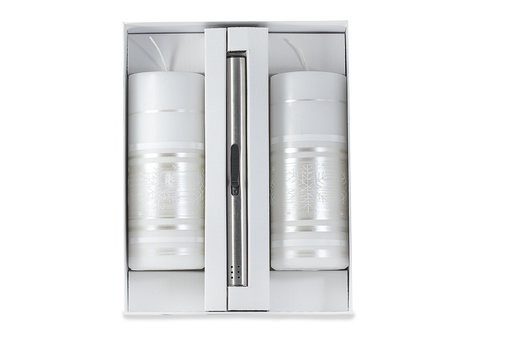Bílá svíčka ručně zdobená stříbrnými metalickými pruhy s krásnými třpytivými vločkami.