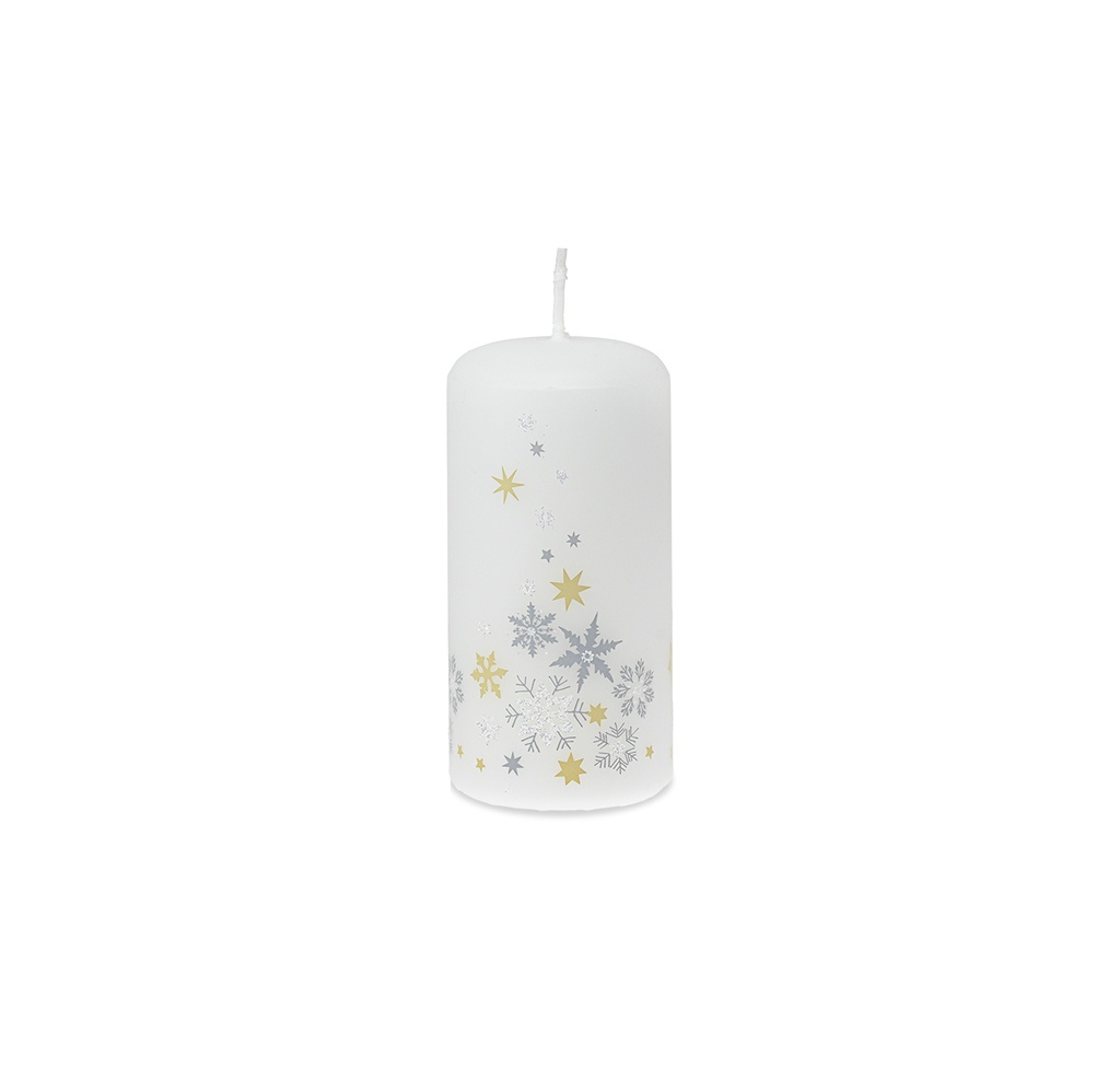 Každá vánoční svíčka je zdobena jemnými vločkami a hvězdičkami, které v mnoha podobách zdánlivě padají a tvoří vrstvy sněhu. Tento detailní design evokuje klidné zimní večery, kdy se krajina halí do sněhové peřiny. Některé detaily na svíčkách jsou navíc třpytivé, jako by byly pokryty mrazivými krystalky, které září jako mráz na sněhu.
