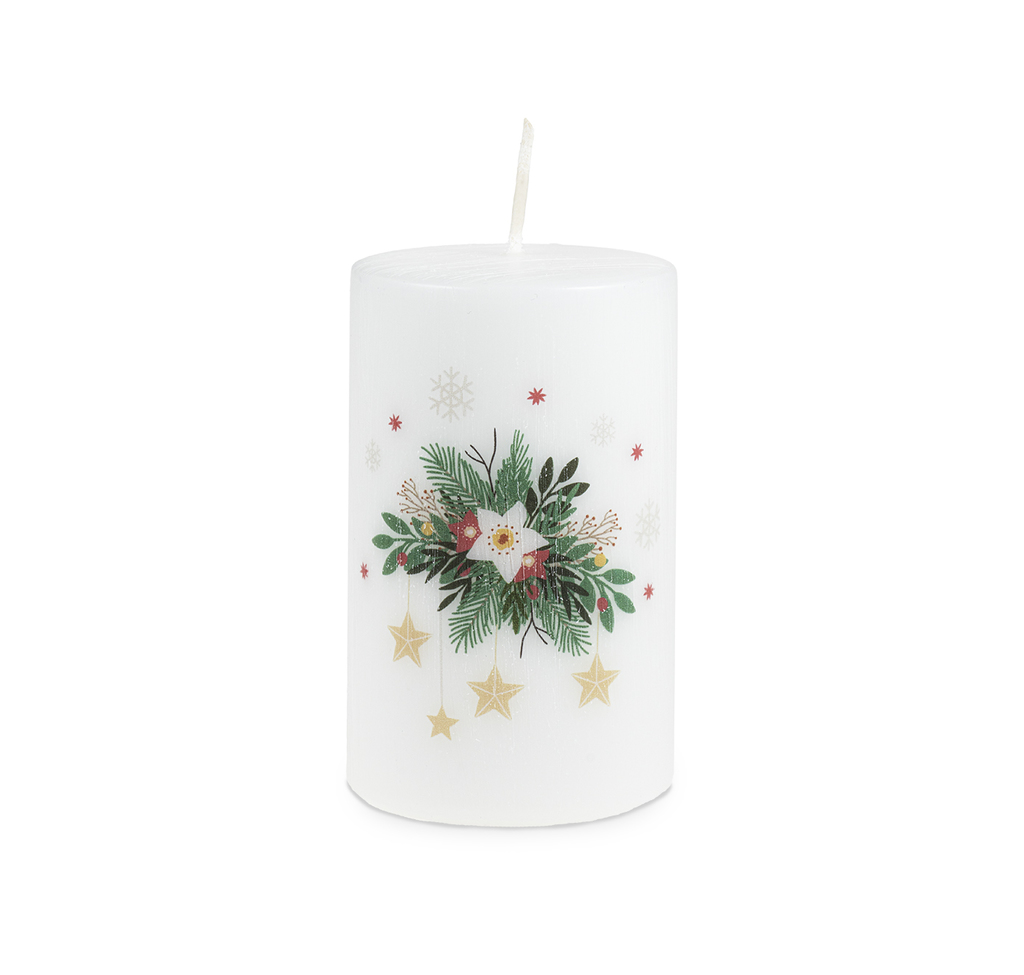 Svíčka s krásným motivem kytice s vánočními hvězdami a s ručně škrábaným povrchem doladí váš interiér k dokonalé vánoční atmosféře.
