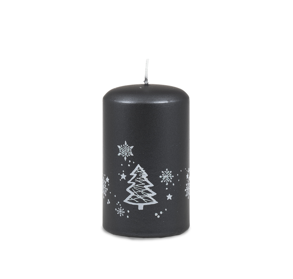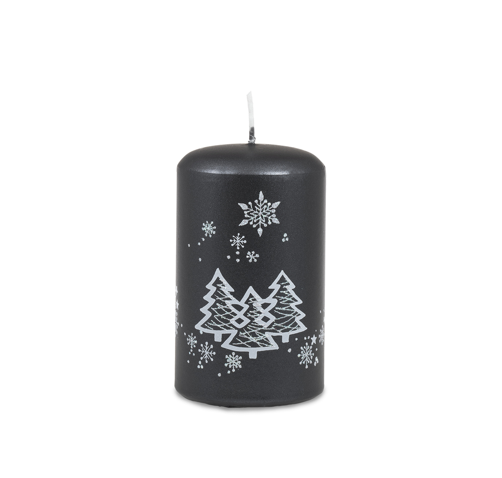 Antracitová střední vánoční svíčka s krásným bílým motivem stromů plných třpytivého lesku.