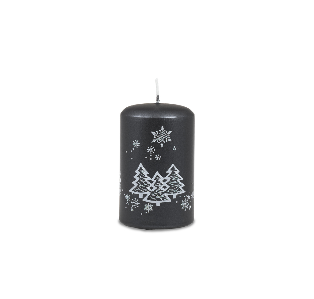 Antracitová malá vánoční svíčka s krásným bílým motivem stromů plných třpytivého lesku.