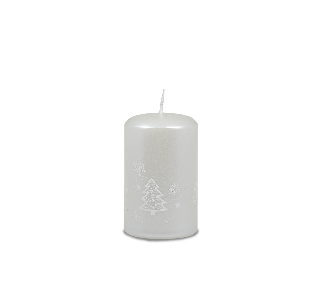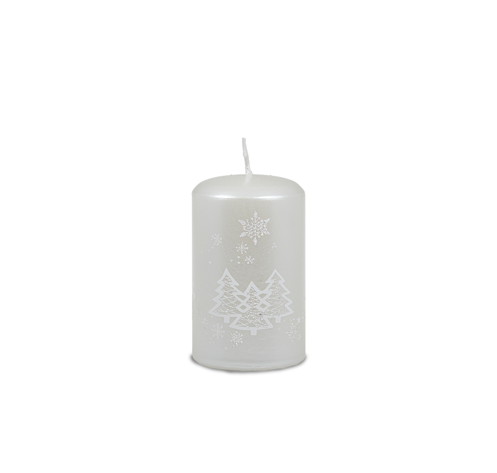Perleťově bílá malá vánoční svíčka s krásným bílým motivem stromů plných třpytivého lesku.