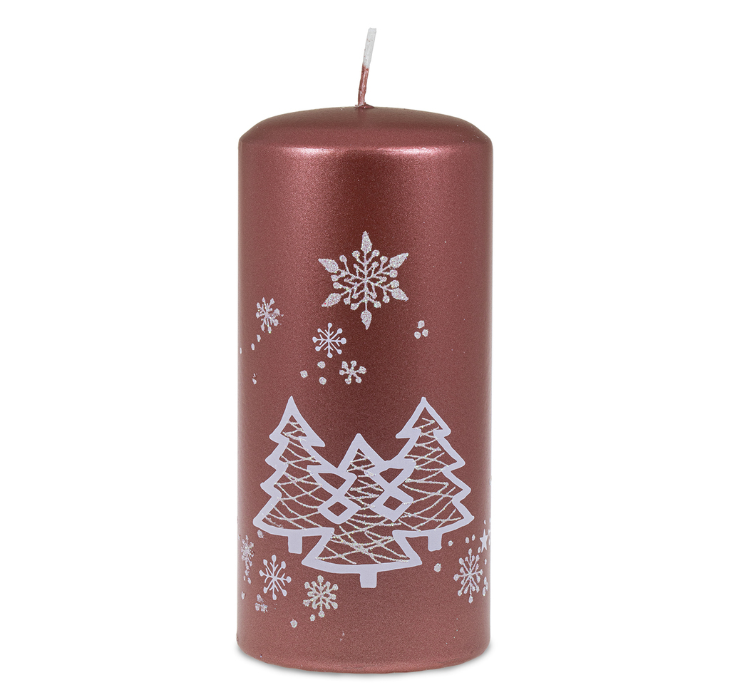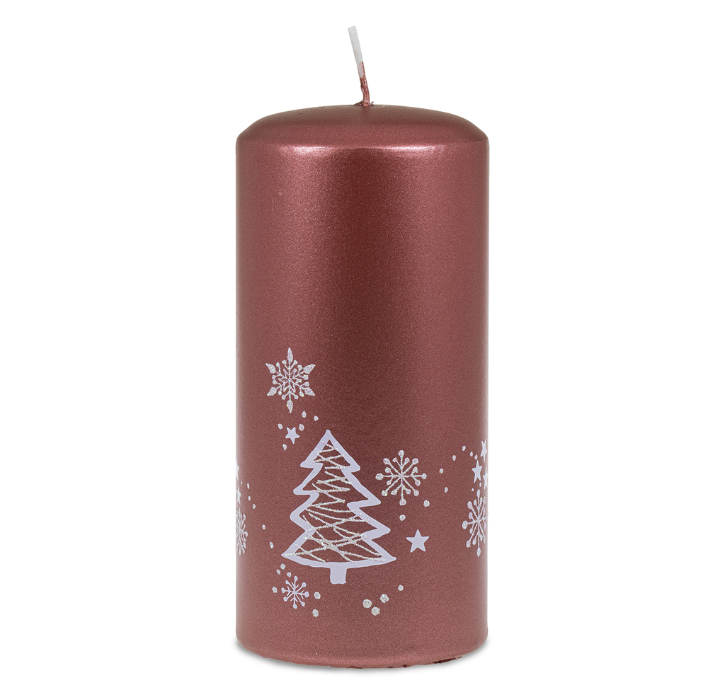 Hnědorůžová velká vánoční svíčka s krásným bílým motivem stromů plných třpytivého lesku.