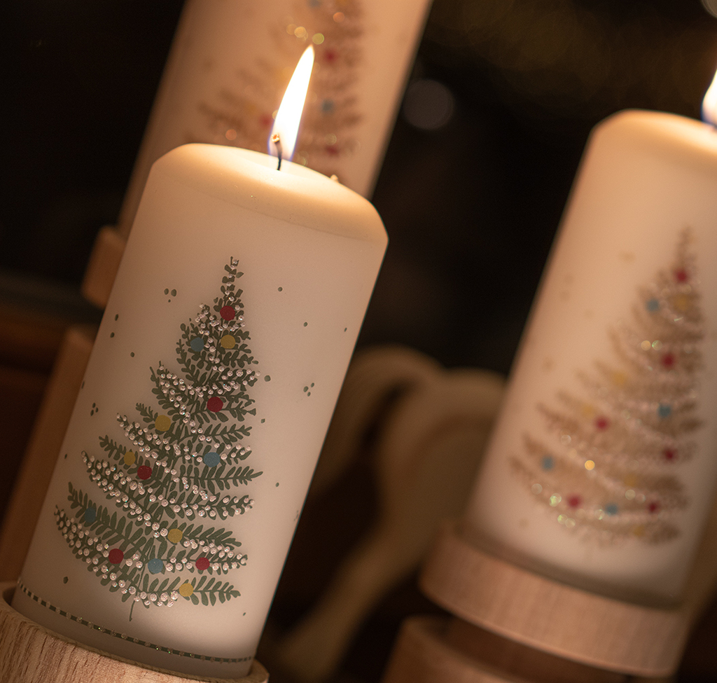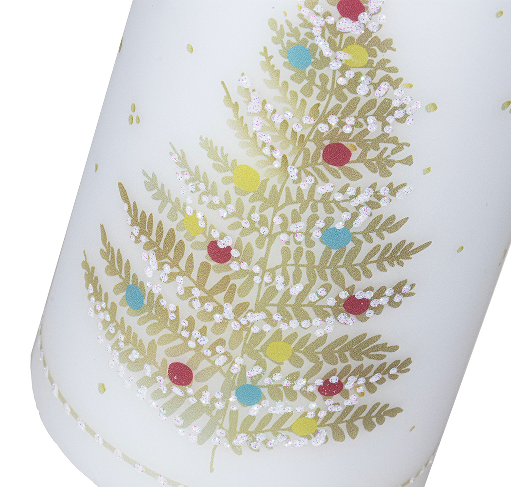 Slavnostní nádech svíčce dodávají ručně aplikované třpytivé detaily a jemná linka v dolní části. Tyto prvky vytvářejí efekt měkkého jasu a připomínají odlesky světla na vánočních ozdobách.
