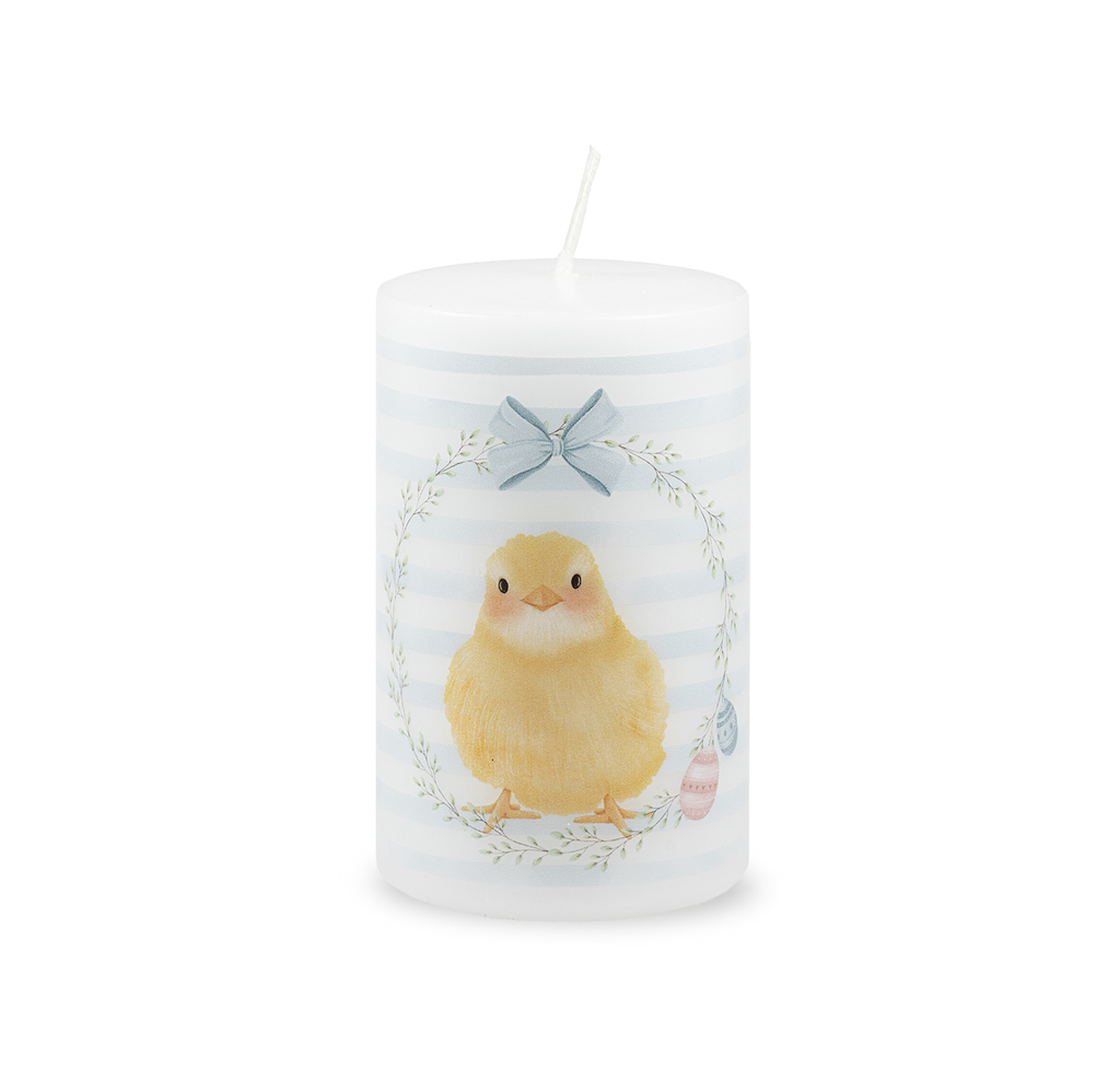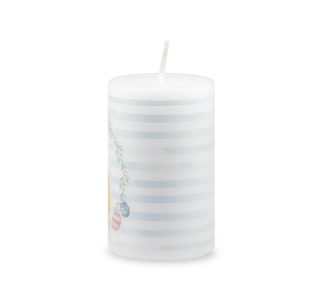 Bílá svíčka se světle modrými proužky a kuřátkem krásně oživí váš interiér a doladí vaši velikonoční dekoraci k dokonalosti.