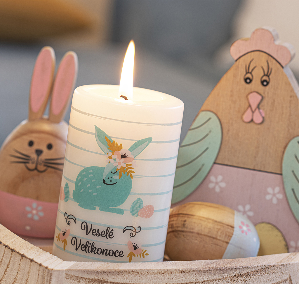 Béžová svíčka s veselým motivem tyrkysového zajíčka s proužky krásně oživí váš interiér a doladí vaši velikonoční dekoraci k dokonalosti.