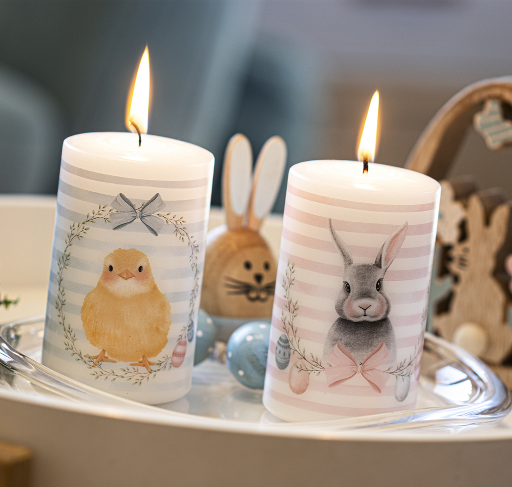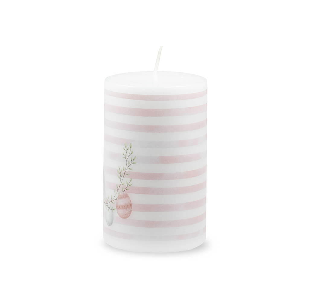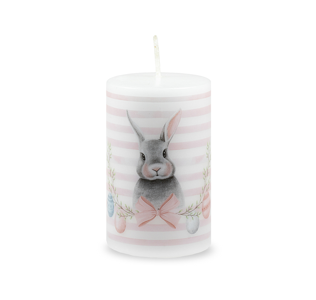 Bílá svíčka se světle růžovými proužky a roztomilým zajíčkem krásně oživí váš interiér a doladí vaši velikonoční dekoraci k dokonalosti.