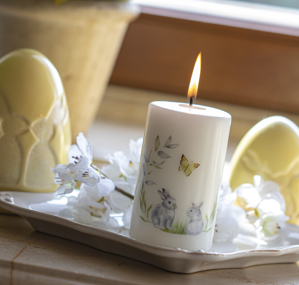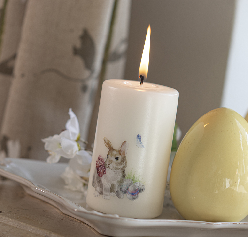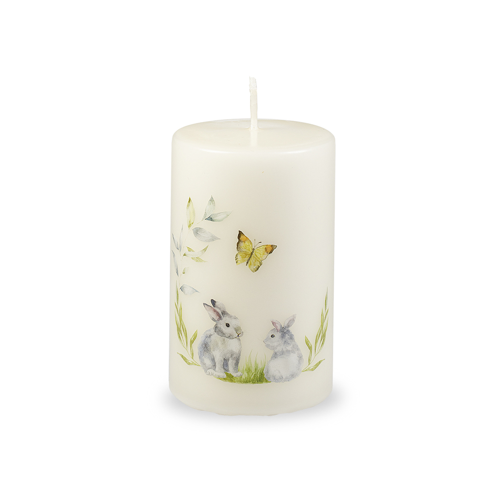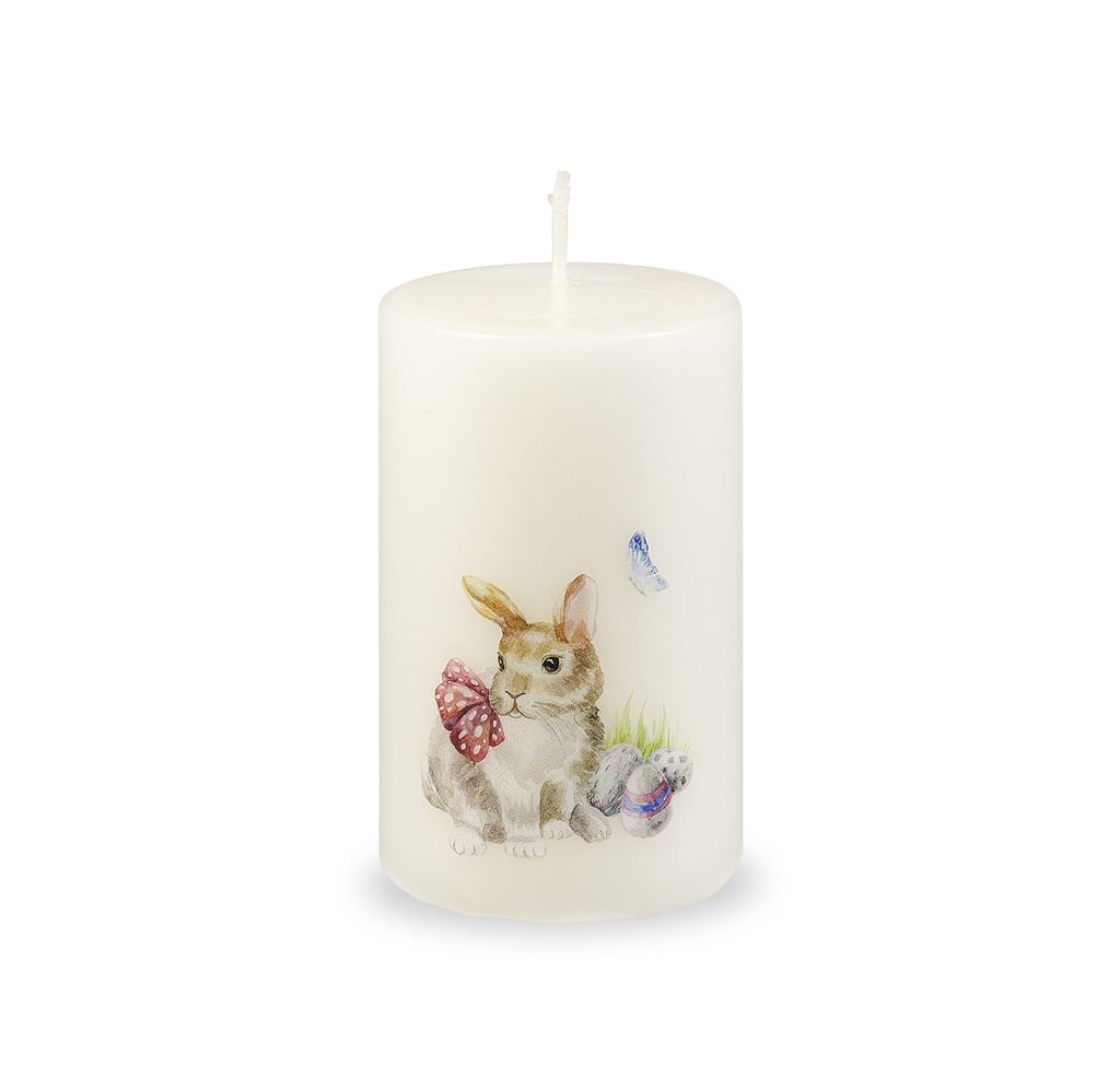 Béžová svíčka s veselým motivem dvou zajíčků z jedné strany a zajíčka s mašličkou ze strany druhé. Tato svíčka v jemných barvách krásně oživí váš interiér a doladí vaši velikonoční dekoraci k dokonalosti.