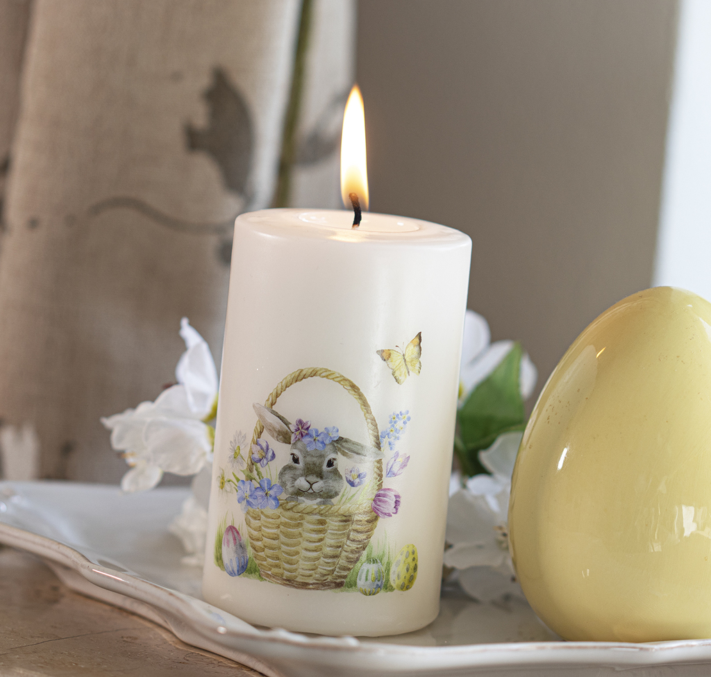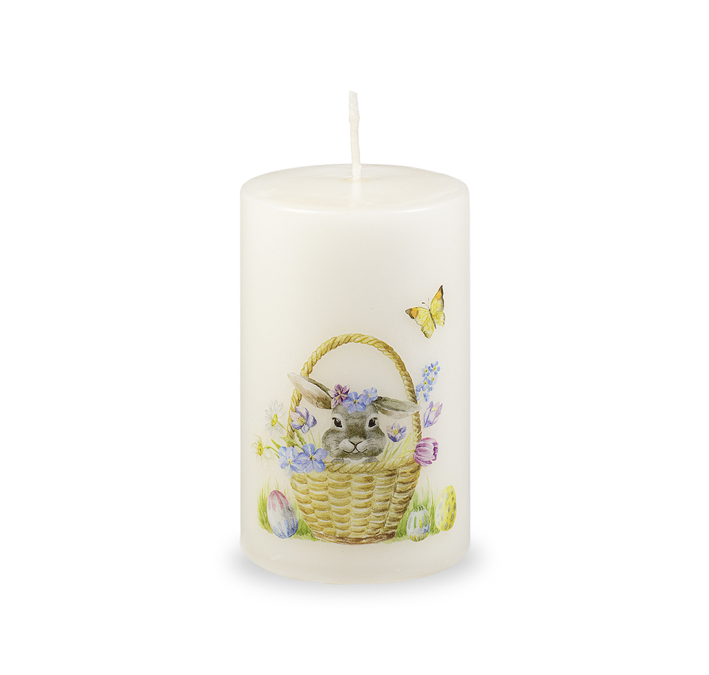 Béžová svíčka s veselým motivem zajíčka v proutěném košíku v jemných barvách krásně oživí váš interiér a doladí vaši velikonoční dekoraci k dokonalosti.