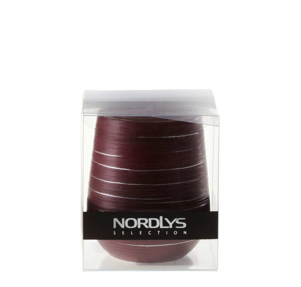 Elegantní vínová svíčka ve skandinávském stylu se strukturovaným povrchem, ručně dozdobená stříbrnými linkami.