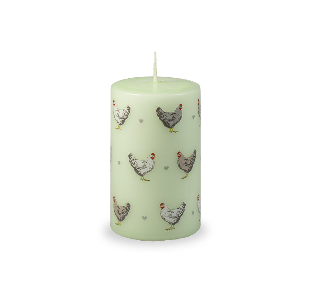 Zelená svíčka s motivem barevných slepiček vám vykouzlí úsměv na tváři.
