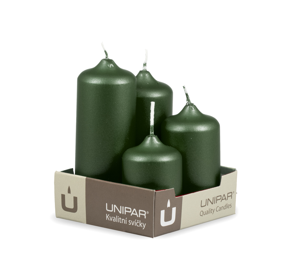 Adventní svíčky v zelené metalické barvě v odstupňovaných velikostech (40x60, 40x75, 40x90, 40x105 mm).